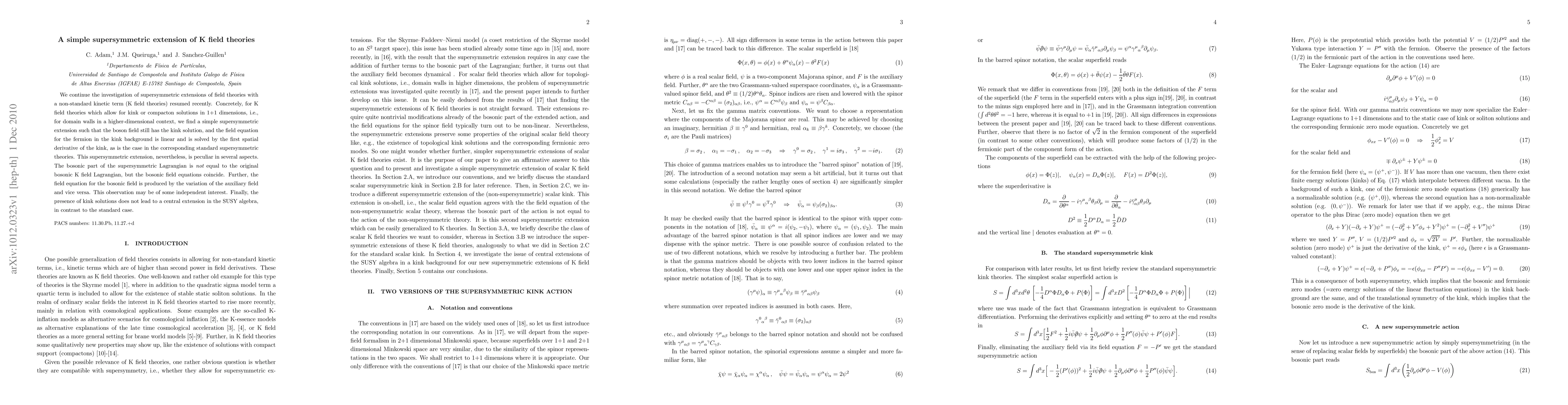 We continue the investigation of supersymmetric extensions of field theories with a non-standard kinetic term (K field theories) resumed recently. Concretely, for K field theories which allow for kink or compacton solutions in 1+1 dimensions, i.e., for domain walls in a higher-dimensional context, we find a simple supersymmetric extension such that the boson field still has the kink solution, and the field equation for the fermion in the kink background is linear and is solved by the first spatial derivative of the kink, as is the case in the corresponding standard supersymmetric theories. This supersymmetric extension, nevertheless, is peculiar in several aspects. The bosonic part of the supersymmetric Lagrangian is not equal to the original bosonic K field Lagrangian, but the bosonic field equations coincide. Further, the field equation for the bosonic field is produced by the variation of the auxiliary field and vice versa. This observation may be of some independent interest. Finally, the presence of kink solutions does not lead to a central extension in the SUSY algebra, in contrast to the standard case.