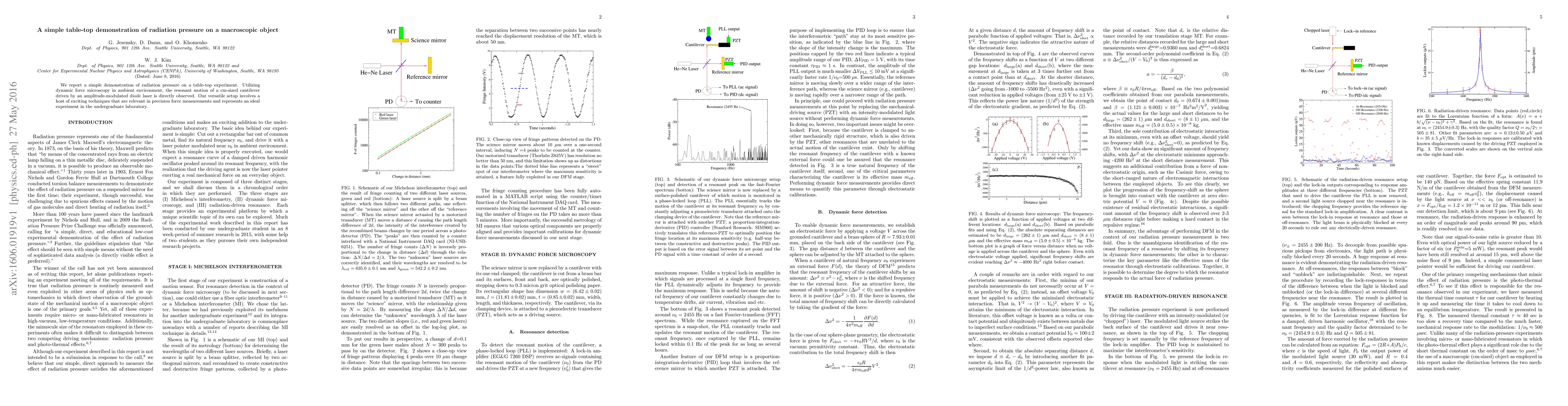 This paper describes a straightforward table-top experiment demonstrating radiation pressure using dynamic force microscopy. It observes the resonant motion of a centimeter-sized cantilever driven by an amplitude-modulated diode laser, showcasing techniques relevant to precision force measurements suitable for undergraduate labs.