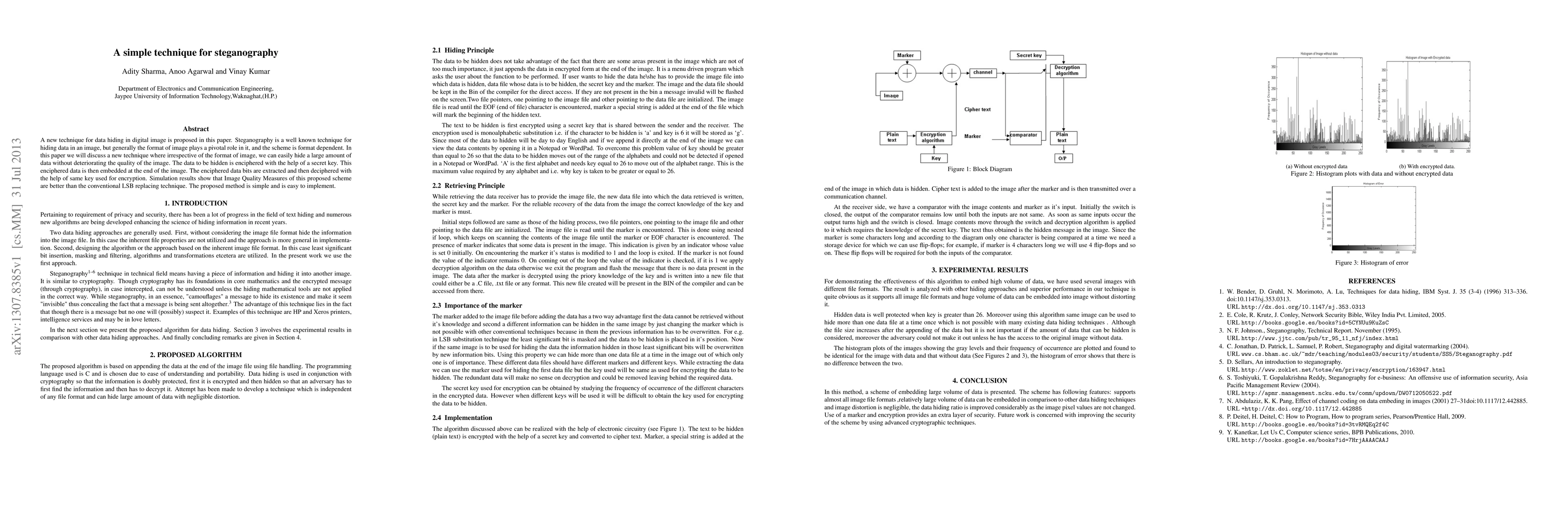 A new technique for data hiding in digital image is proposed in this paper. Steganography is a well known technique for hiding data in an image, but generally the format of image plays a pivotal role in it, and the scheme is format dependent. In this paper we will discuss a new technique where irrespective of the format of image, we can easily hide a large amount of data without deteriorating the quality of the image. The data to be hidden is enciphered with the help of a secret key. This enciphered data is then embedded at the end of the image. The enciphered data bits are extracted and then deciphered with the help of same key used for encryption. Simulation results show that Image Quality Measures of this proposed scheme are better than the conventional LSB replacing technique. The proposed method is simple and is easy to implement.