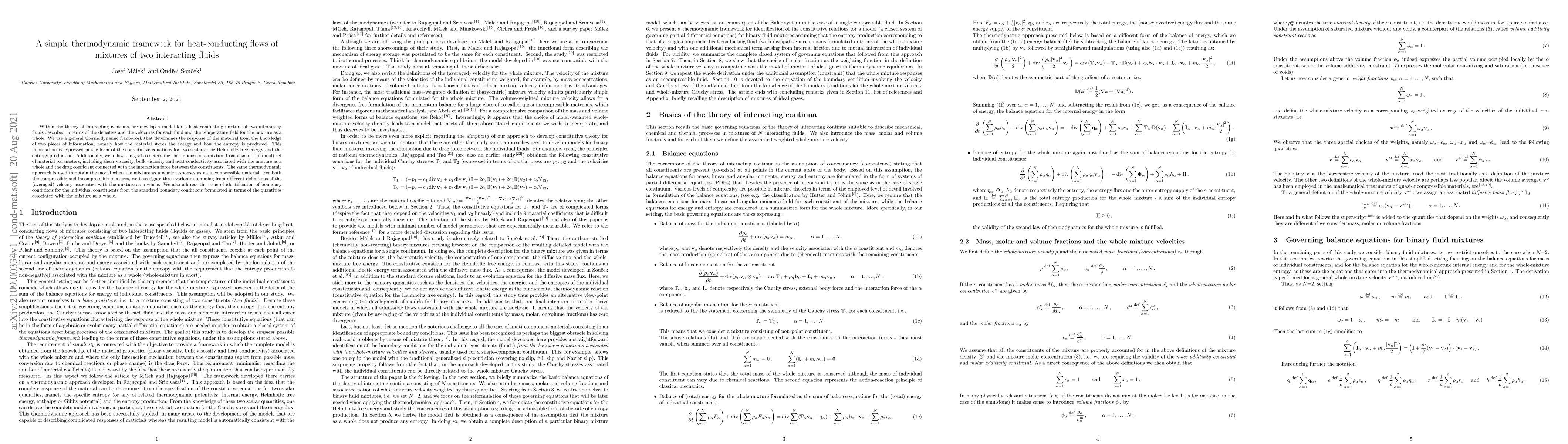 Within the theory of interacting continua, we develop a model for a heat conducting mixture of two interacting fluids described in terms of the densities and the velocities for each fluid and the temperature field for the mixture as a whole. We use a general thermodynamic framework that determines the response of the material from the knowledge of two pieces of information, namely how the material stores the energy and how the entropy is produced. This information is expressed in the form of the constitutive equations for two scalars: the Helmholtz free energy and the entropy production. Additionally, we follow the goal to determine the response of a mixture from a small (minimal) set of material parameters, including shear viscosity, bulk viscosity and heat conductivity associated with the mixture as a whole and the drag coefficient connected with the interaction force between the constituents. The same thermodynamic approach is used to obtain the model when the mixture as a whole responses as an incompressible material. For both the compressible and incompressible mixtures, we investigate three variants stemming from different definitions of the (averaged) velocity associated with the mixture as a whole. We also address the issue of identification of boundary conditions for the individual constituents from the standard boundary conditions formulated in terms of the quantities associated with the mixture as a whole.