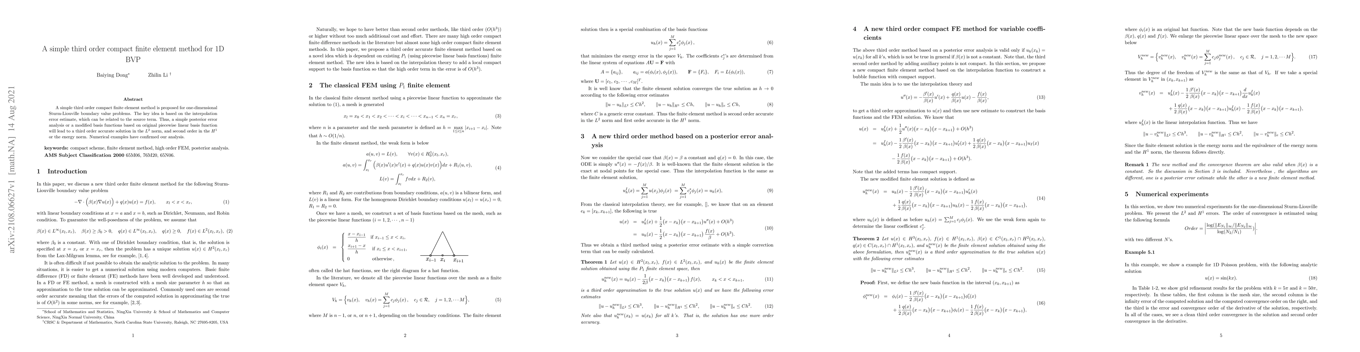 A simple third order compact finite element method is proposed for one-dimensional Sturm-Liouville boundary value problems. The key idea is based on the interpolation error estimate, which can be related to the source term. Thus, a simple posterior error analysis or a modified basis functions based on original piecewise linear basis function will lead to a third order accurate solution in the $L^2$ norm, and second order in the $H^1$ or the energy norm. Numerical examples have confirmed our analysis.