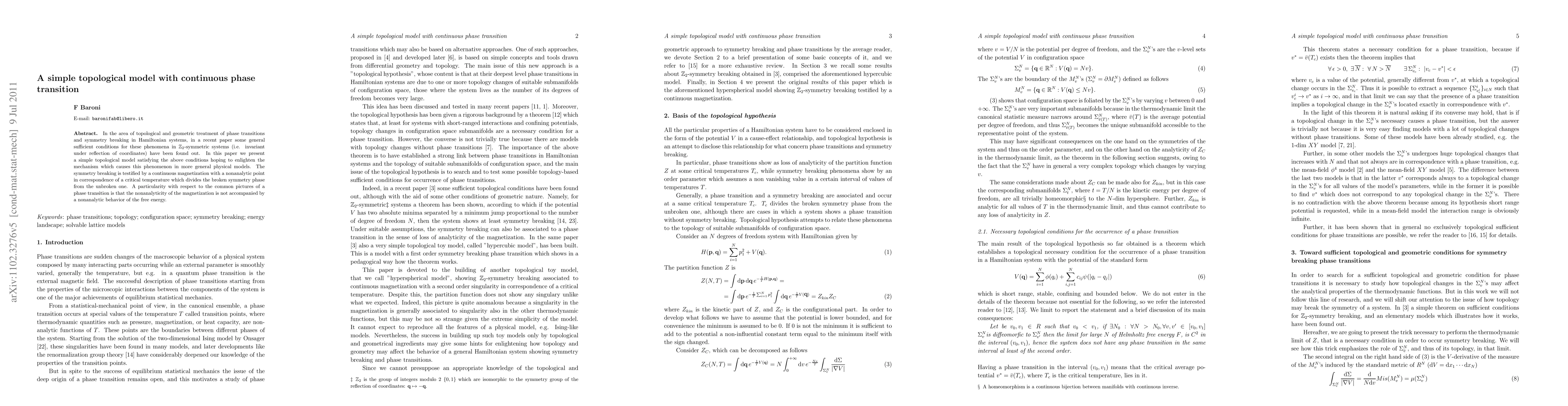 In the area of topological and geometric treatment of phase transitions and symmetry breaking in Hamiltonian systems, in a recent paper some general sufficient conditions for these phenomena in $\mathbb{Z}_2$-symmetric systems (i.e. invariant under reflection of coordinates) have been found out. In this paper we present a simple topological model satisfying the above conditions hoping to enlighten the mechanism which causes this phenomenon in more general physical models. The symmetry breaking is testified by a continuous magnetization with a nonanalytic point in correspondence of a critical temperature which divides the broken symmetry phase from the unbroken one. A particularity with respect to the common pictures of a phase transition is that the nonanalyticity of the magnetization is not accompanied by a nonanalytic behavior of the free energy.