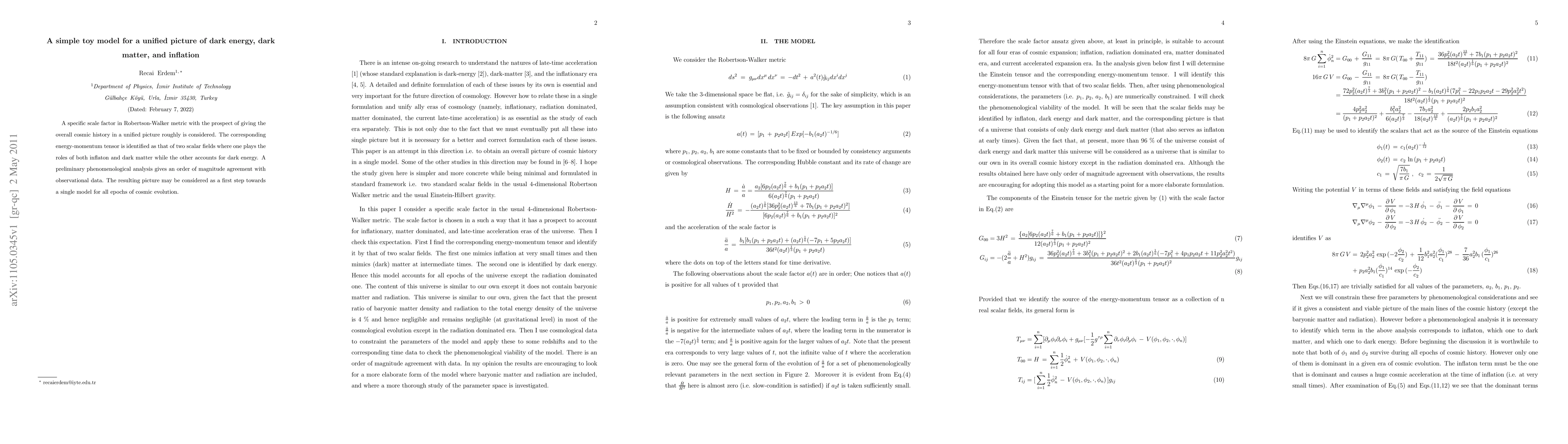 This research proposes a unified model for dark energy, dark matter, and inflation using a specific scale factor in the Robertson-Walker metric. It suggests that two scalar fields can represent these phenomena, with one field acting as both inflaton and dark matter, and the other accounting for dark energy. The model shows promising agreement with observational data, potentially offering a single model for all cosmic evolution phases.