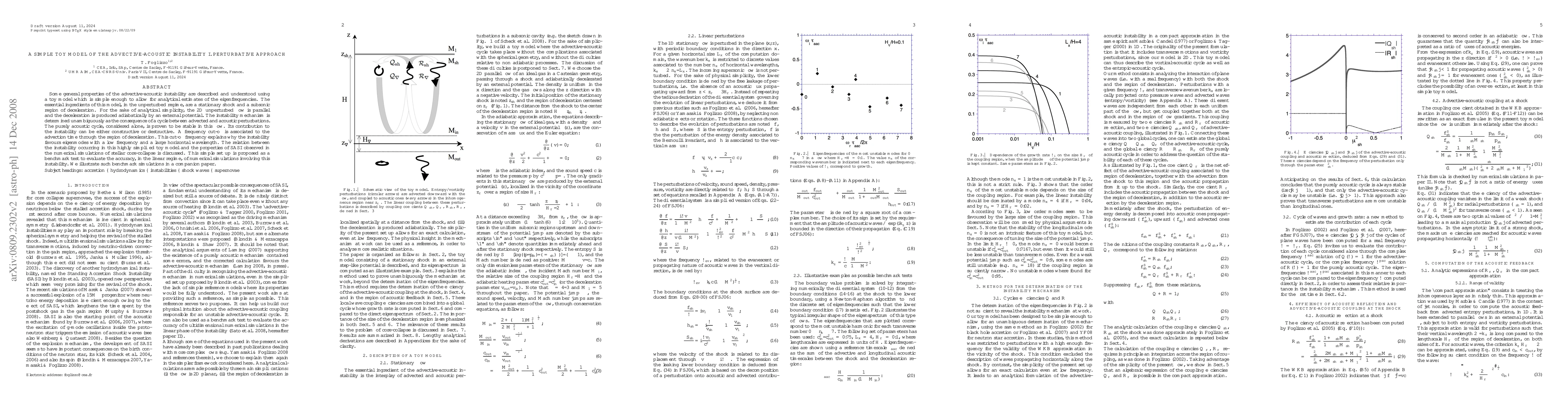 Some general properties of the advective-acoustic instability are described and understood using a toy model which is simple enough to allow for analytical estimates of the eigenfrequencies. The essential ingredients of this model, in the unperturbed regime, are a stationary shock and a subsonic region of deceleration. For the sake of analytical simplicity, the 2D unperturbed flow is parallel and the deceleration is produced adiabatically by an external potential. The instability mechanism is determined unambiguously as the consequence of a cycle between advected and acoustic perturbations. The purely acoustic cycle, considered alone, is proven to be stable in this flow. Its contribution to the instability can be either constructive or destructive. A frequency cut-off is associated to the advection time through the region of deceleration. This cut-off frequency explains why the instability favours eigenmodes with a low frequency and a large horizontal wavelength. The relation between the instability occurring in this highly simplified toy model and the properties of SASI observed in the numerical simulations of stellar core-collapse is discussed. This simple set up is proposed as a benchmark test to evaluate the accuracy, in the linear regime, of numerical simulations involving this instability. We illustrate such benchmark simulations in a companion paper.