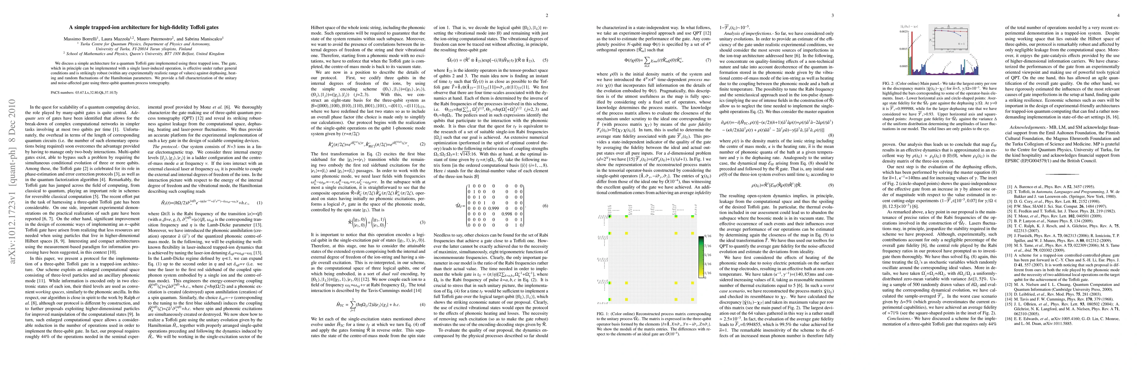 This paper proposes a simple trapped-ion architecture for implementing high-fidelity Toffoli gates using three ions, demonstrating robustness against various decoherence sources and characterizing the gate through quantum process tomography.