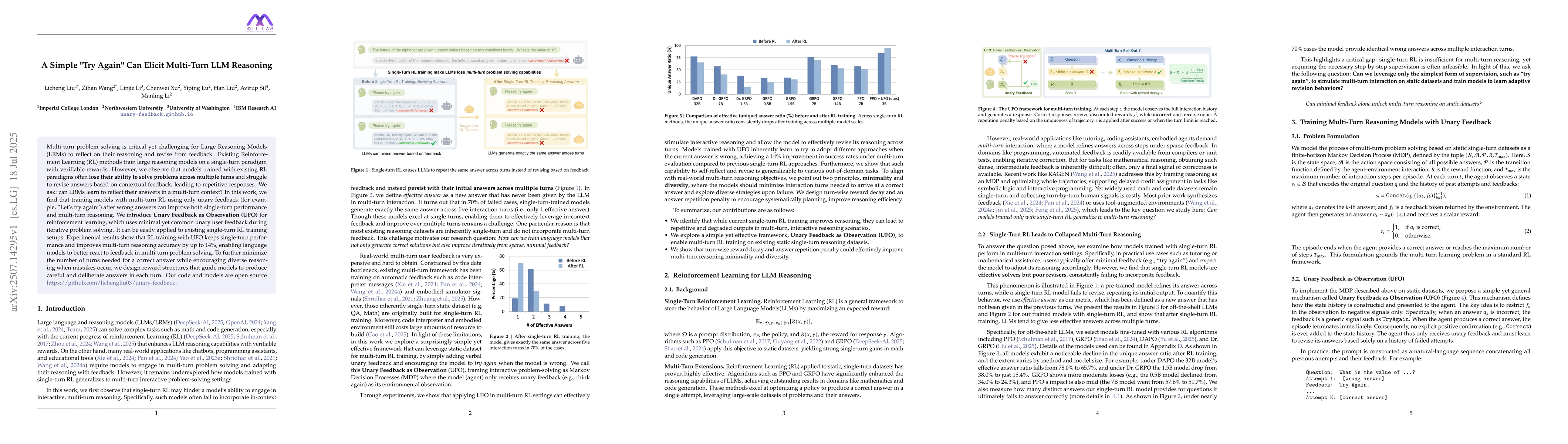 Multi-turn problem solving is critical yet challenging for Large Reasoning Models (LRMs) to reflect on their reasoning and revise from feedback. Existing Reinforcement Learning (RL) methods train large reasoning models on a single-turn paradigm with verifiable rewards. However, we observe that models trained with existing RL paradigms often lose their ability to solve problems across multiple turns and struggle to revise answers based on contextual feedback, leading to repetitive responses. We ask: can LRMs learn to reflect their answers in a multi-turn context? In this work, we find that training models with multi-turn RL using only unary feedback (e.g., "Let's try again") after wrong answers can improve both single-turn performance and multi-turn reasoning. We introduce Unary Feedback as Observation (UFO) for reinforcement learning, which uses minimal yet common unary user feedback during iterative problem solving. It can be easily applied to existing single-turn RL training setups. Experimental results show that RL training with UFO keeps single-turn performance and improves multi-turn reasoning accuracy by up to 14%, enabling language models to better react to feedback in multi-turn problem solving. To further minimize the number of turns needed for a correct answer while encouraging diverse reasoning when mistakes occur, we design reward structures that guide models to produce careful and deliberate answers in each turn. Code: https://github.com/lichengliu03/unary-feedback