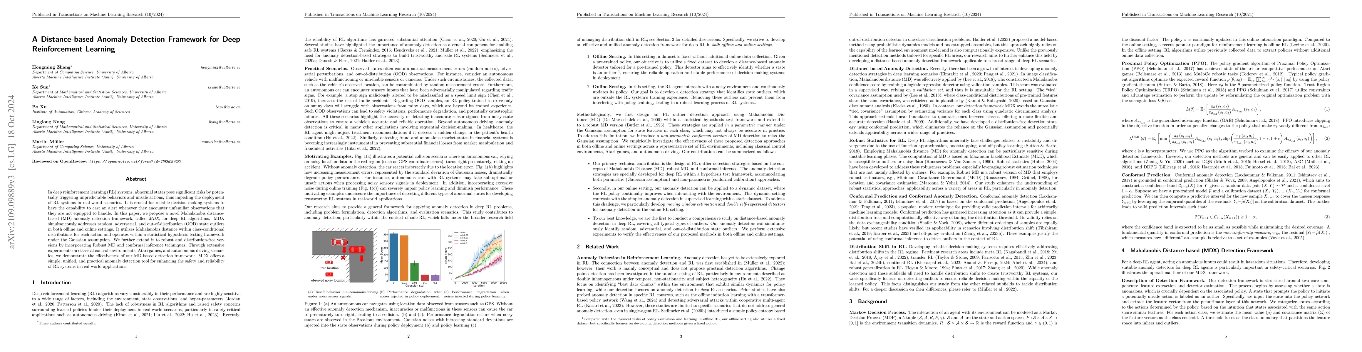 This paper proposes a unified framework for detecting anomalies in deep reinforcement learning (RL) that identifies random, adversarial, and out-of-distribution state outliers using class-conditional distributions and Mahalanobis Distance. The method is validated through experiments on Atari games, marking the first detailed study of anomaly detection in deep RL.