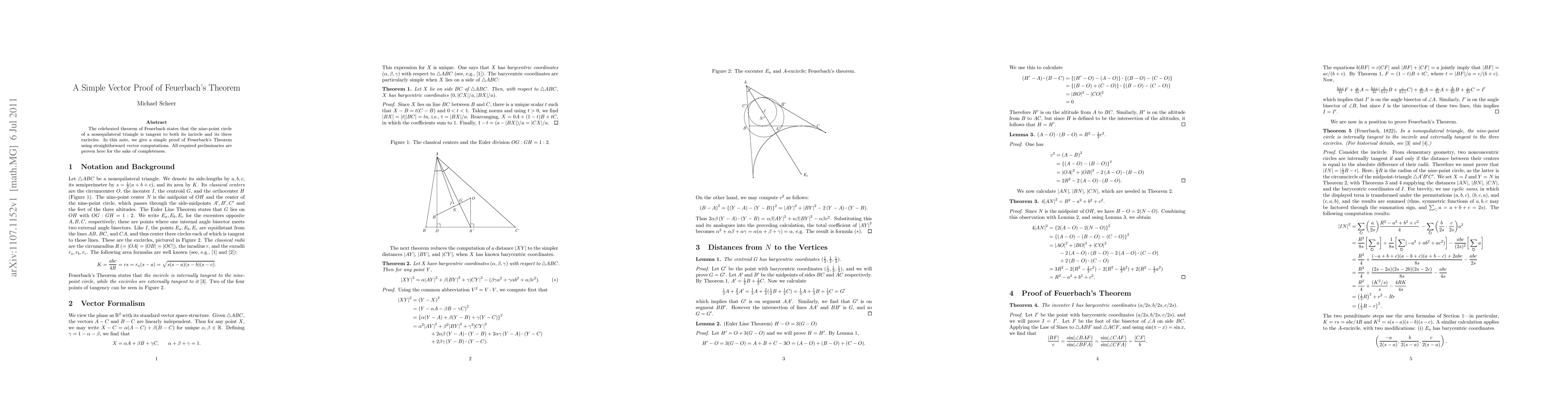 This paper presents a straightforward vector proof of Feuerbach's Theorem, which asserts that the nine-point circle of a nonequilateral triangle is tangent to its incircle and three excircles. The authors provide necessary preliminary vector computations to support their proof.