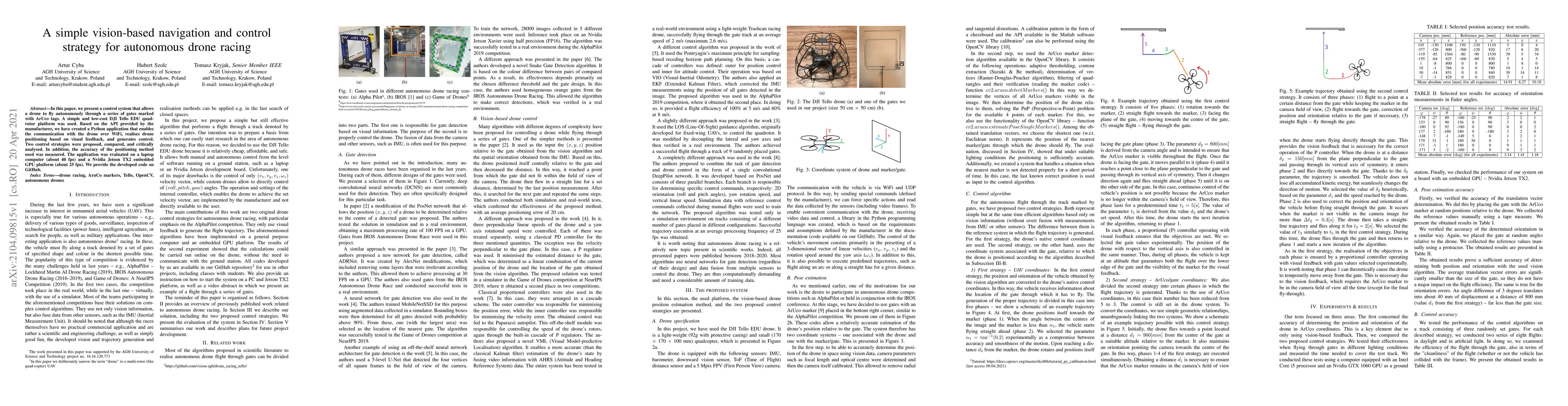 In this paper, we present a control system that allows a drone to fly autonomously through a series of gates marked with ArUco tags. A simple and low-cost DJI Tello EDU quad-rotor platform was used. Based on the API provided by the manufacturer, we have created a Python application that enables the communication with the drone over WiFi, realises drone positioning based on visual feedback, and generates control. Two control strategies were proposed, compared, and critically analysed. In addition, the accuracy of the positioning method used was measured. The application was evaluated on a laptop computer (about 40 fps) and a Nvidia Jetson TX2 embedded GPU platform (about 25 fps). We provide the developed code on GitHub.