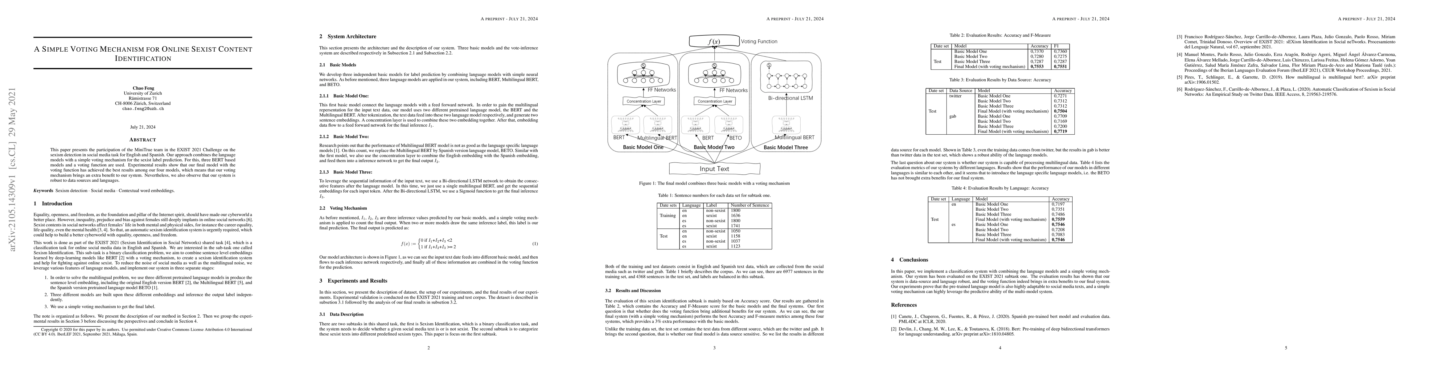 This paper presents the participation of the MiniTrue team in the EXIST 2021 Challenge on the sexism detection in social media task for English and Spanish. Our approach combines the language models with a simple voting mechanism for the sexist label prediction. For this, three BERT based models and a voting function are used. Experimental results show that our final model with the voting function has achieved the best results among our four models, which means that our voting mechanism brings an extra benefit to our system. Nevertheless, we also observe that our system is robust to data sources and languages.