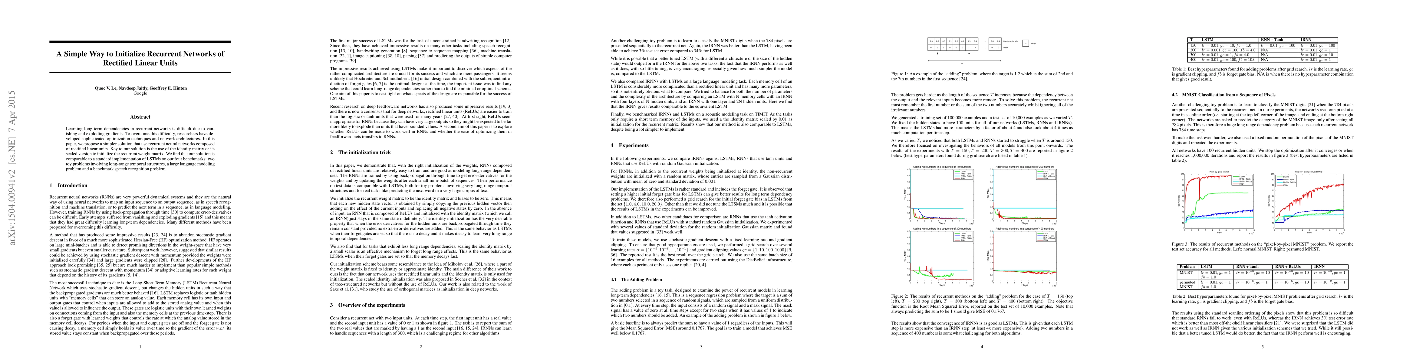 This paper proposes a simple initialization method for recurrent networks using rectified linear units (ReLUs) by initializing the recurrent weight matrix with an identity matrix or its scaled version. The method shows comparable performance to LSTM on four benchmarks, including long-range temporal structures, language modeling, and speech recognition.