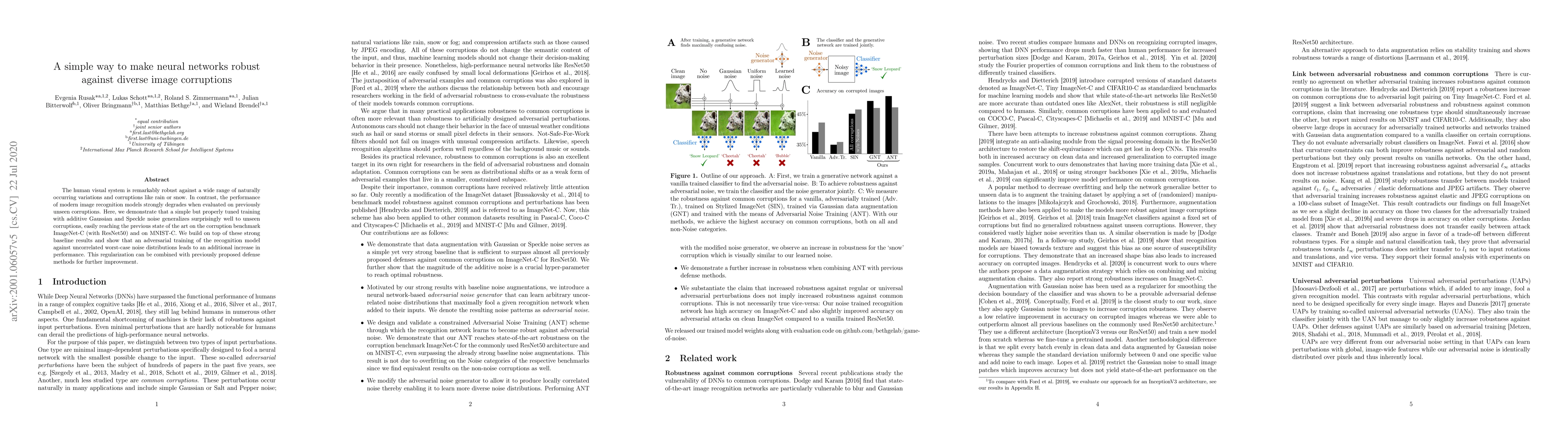 This paper proposes a simple training method using Gaussian and Speckle noise to make neural networks robust against diverse image corruptions, achieving state-of-the-art results on ImageNet-C and MNIST-C. Further adversarial training against worst-case noise distributions enhances robustness, and can be combined with other defense methods for additional improvements.