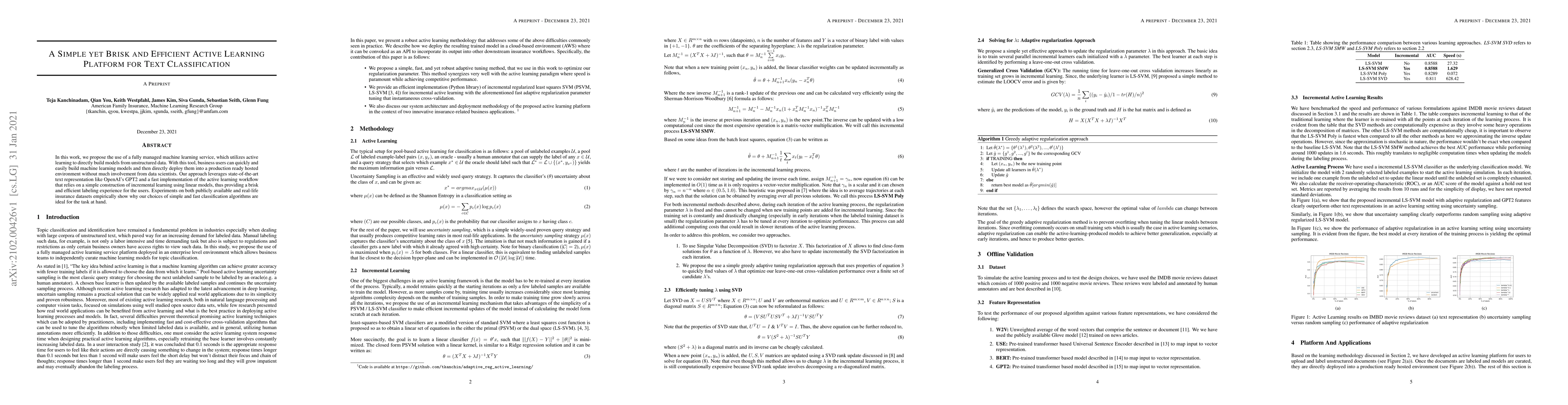 This research proposes a simple active learning platform for text classification that enables business users to build machine learning models quickly and deploy them into production environments without extensive data scientist involvement.