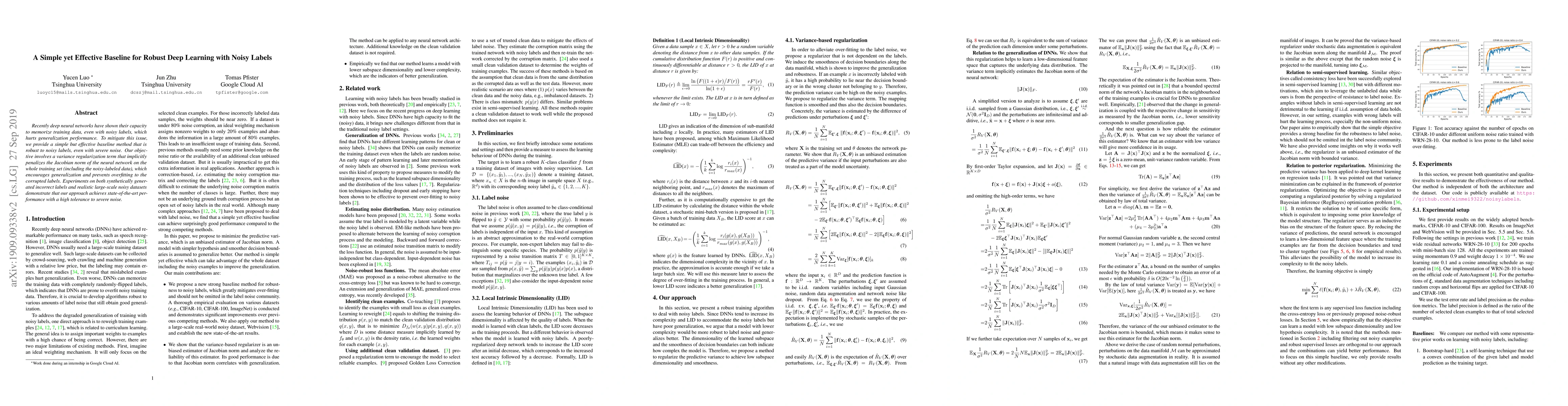 This paper proposes a simple yet effective baseline method for robust deep learning under noisy labels, employing a variance regularization term that penalizes the Jacobian norm to improve generalization and prevent overfitting. Experimental results show state-of-the-art performance on both synthetic and real-world noisy datasets.