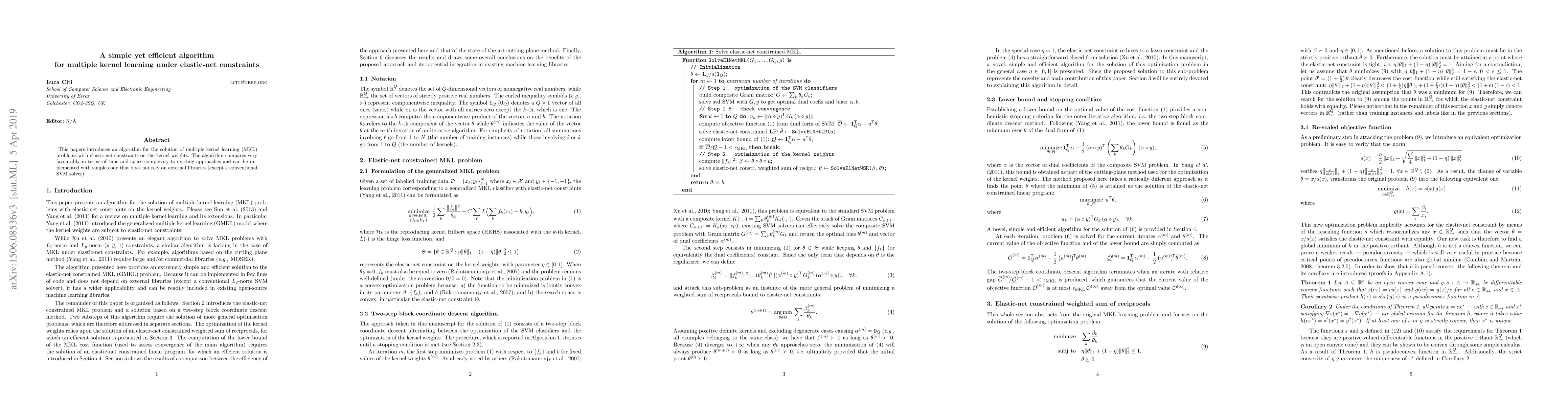 Summary: This paper presents an efficient algorithm for multiple kernel learning with elastic-net constraints, demonstrating superior time and space complexity compared to existing methods, and is implementable with straightforward code without requiring external libraries beyond a standard SVM solver.