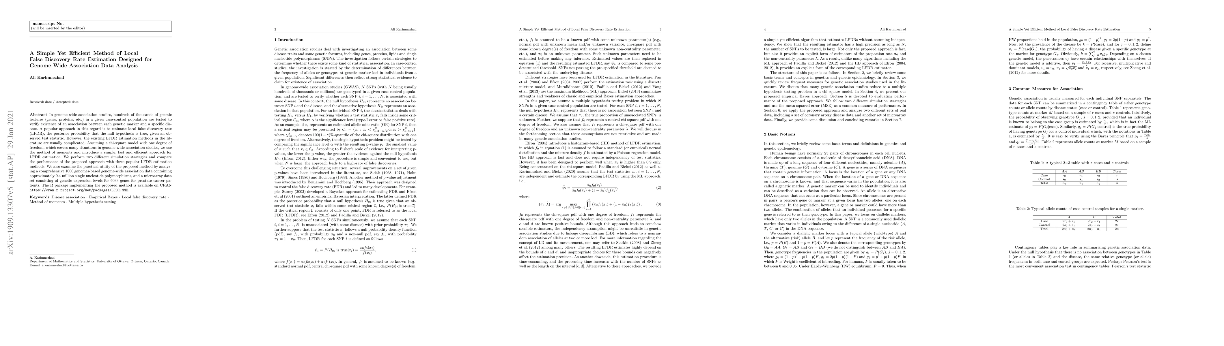 This paper introduces a straightforward parametric method for estimating local false discovery rate (LFDR) in genome-wide association studies, based on a chi-square model. The proposed method, implemented in an R package, is compared against existing methods through simulations and real-world data analysis, demonstrating its efficiency and accuracy.