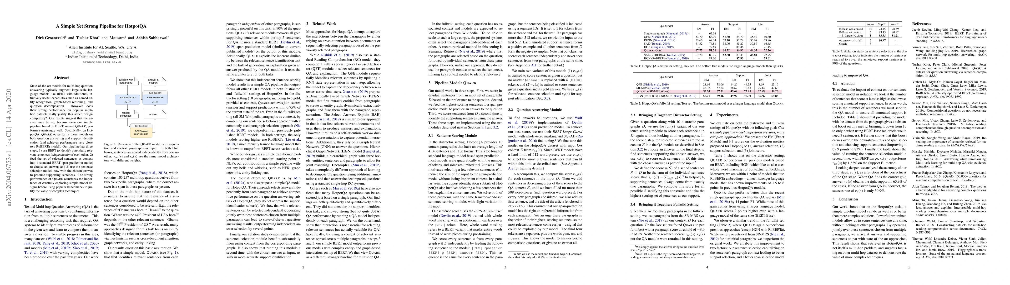 State-of-the-art models for multi-hop question answering typically augment large-scale language models like BERT with additional, intuitively useful capabilities such as named entity recognition, graph-based reasoning, and question decomposition. However, does their strong performance on popular multi-hop datasets really justify this added design complexity? Our results suggest that the answer may be no, because even our simple pipeline based on BERT, named Quark, performs surprisingly well. Specifically, on HotpotQA, Quark outperforms these models on both question answering and support identification (and achieves performance very close to a RoBERTa model). Our pipeline has three steps: 1) use BERT to identify potentially relevant sentences independently of each other; 2) feed the set of selected sentences as context into a standard BERT span prediction model to choose an answer; and 3) use the sentence selection model, now with the chosen answer, to produce supporting sentences. The strong performance of Quark resurfaces the importance of carefully exploring simple model designs before using popular benchmarks to justify the value of complex techniques.
