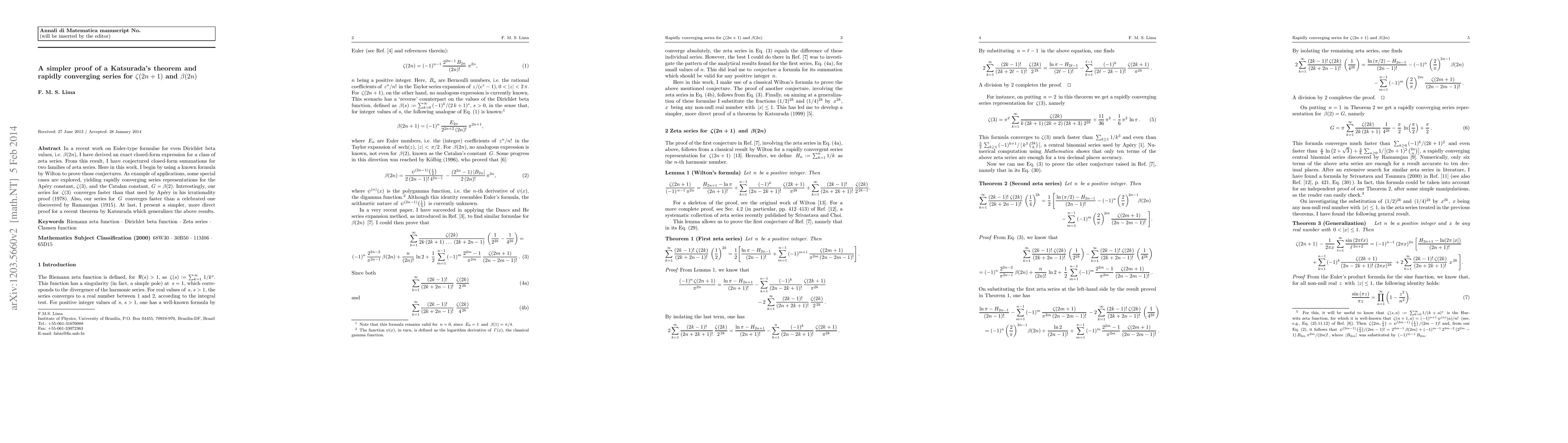 This paper provides a simpler proof for Katsurada's theorem and introduces rapidly converging series for $\zeta(2n+1)$ and $\beta(2n)$. It derives faster converging series for $\zeta(3)$ and the Catalan constant $G$, surpassing historical results by Apéry and Ramanujan.
