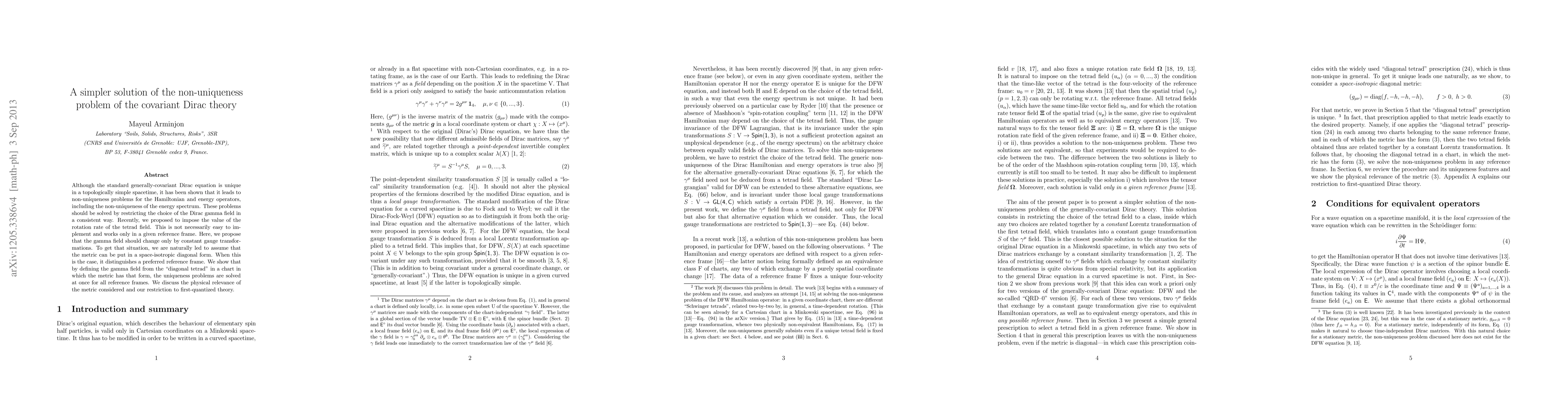 Although the standard generally-covariant Dirac equation is unique in a topologically simple spacetime, it has been shown that it leads to non-uniqueness problems for the Hamiltonian and energy operators, including the non-uniqueness of the energy spectrum. These problems should be solved by restricting the choice of the Dirac gamma field in a consistent way. Recently, we proposed to impose the value of the rotation rate of the tetrad field. This is not necessarily easy to implement and works only in a given reference frame. Here, we propose that the gamma field should change only by constant gauge transformations. To get that situation, we are naturally led to assume that the metric can be put in a space-isotropic diagonal form. When this is the case, it distinguishes a preferred reference frame. We show that by defining the gamma field from the "diagonal tetrad" in a chart in which the metric has that form, the uniqueness problems are solved at once for all reference frames. We discuss the physical relevance of the metric considered and our restriction to first-quantized theory.