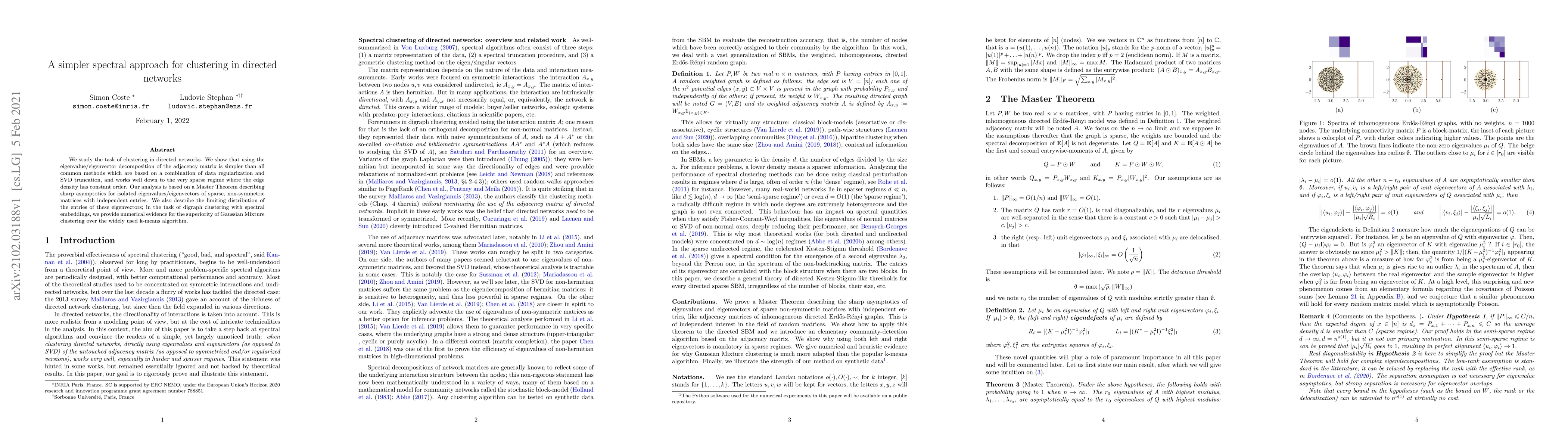 We study the task of clustering in directed networks. We show that using the eigenvalue/eigenvector decomposition of the adjacency matrix is simpler than all common methods which are based on a combination of data regularization and SVD truncation, and works well down to the very sparse regime where the edge density has constant order. Our analysis is based on a Master Theorem describing sharp asymptotics for isolated eigenvalues/eigenvectors of sparse, non-symmetric matrices with independent entries. We also describe the limiting distribution of the entries of these eigenvectors; in the task of digraph clustering with spectral embeddings, we provide numerical evidence for the superiority of Gaussian Mixture clustering over the widely used k-means algorithm.