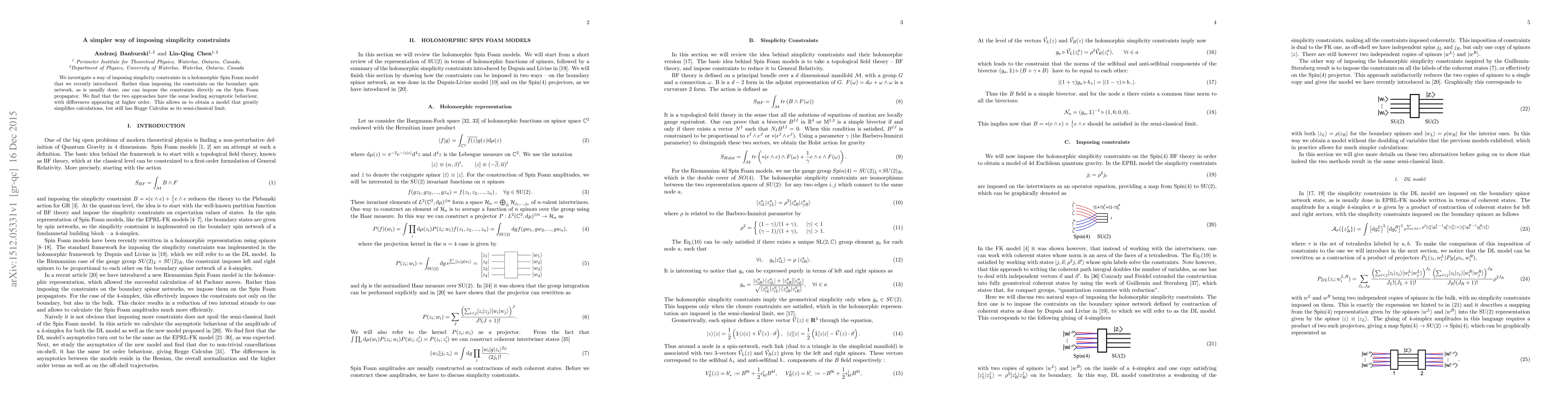 We investigate a way of imposing simplicity constraints in a holomorphic Spin Foam model that we recently introduced. Rather than imposing the constraints on the boundary spin network, as is usually done, one can impose the constraints directly on the Spin Foam propagator. We find that the two approaches have the same leading asymptotic behaviour, with differences appearing at higher order. This allows us to obtain a model that greatly simplifies calculations, but still has Regge Calculus as its semi-classical limit.