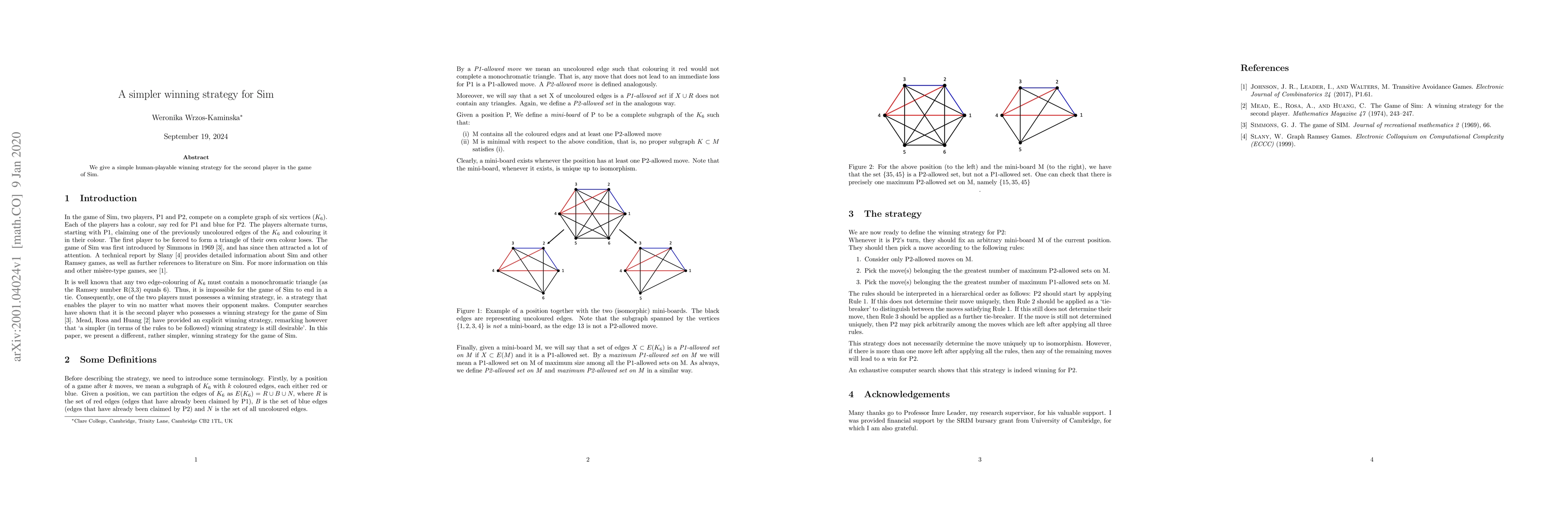 Summary: This paper presents an easy-to-understand winning strategy for the second player in the game of Sim, allowing human players to consistently triumph. The strategy is straightforward enough for casual gamers to employ effectively.
