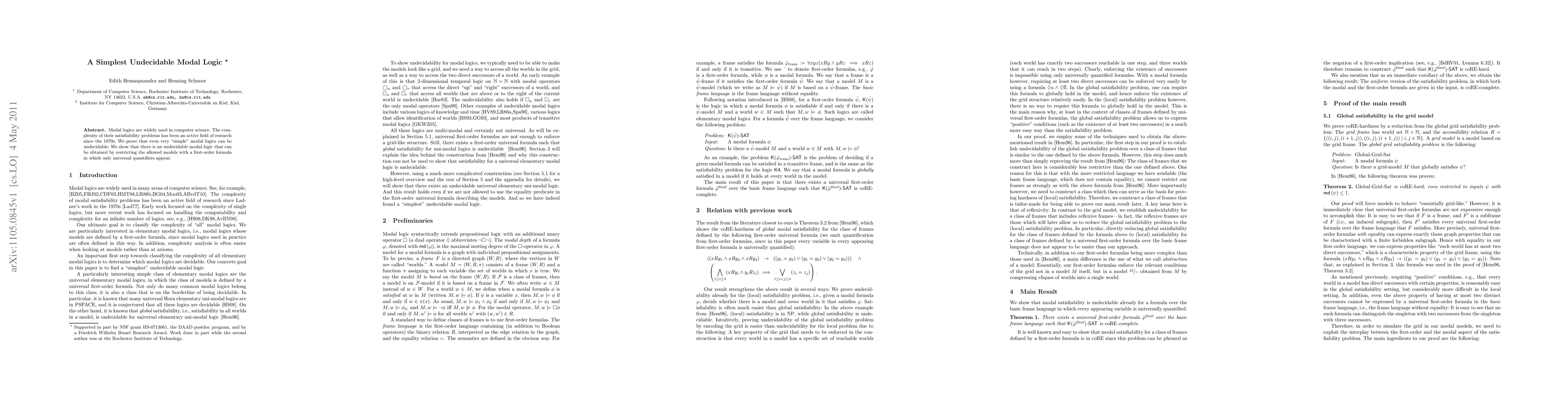 Summary: The paper demonstrates that a seemingly straightforward modal logic, obtained by limiting model types through a first-order formula with only universal quantifiers, remains undecidable, highlighting the complexity of satisfiability problems in modal logics.