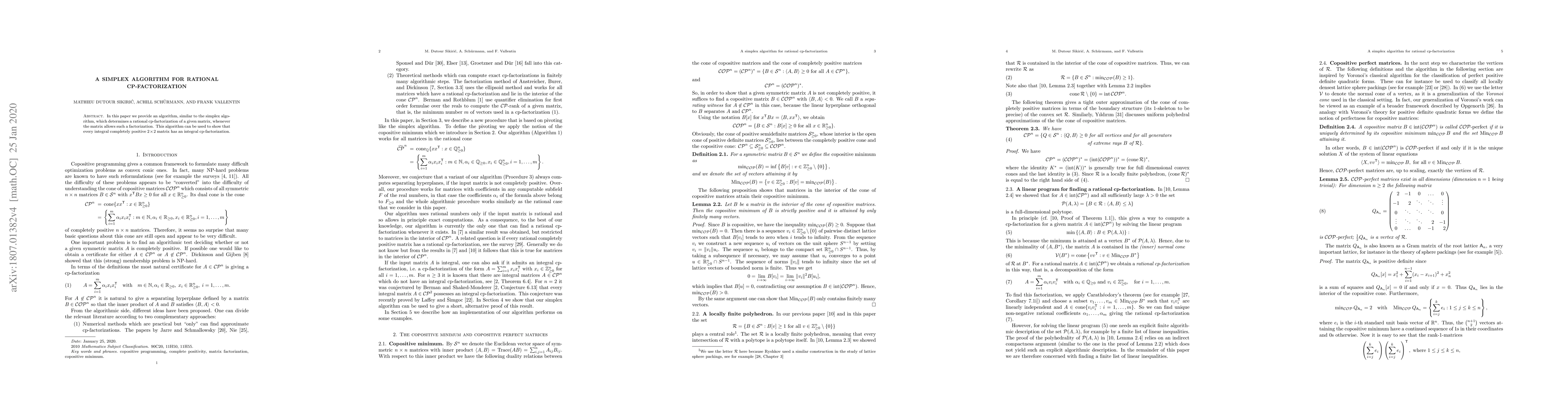 In this paper we provide an algorithm, similar to the simplex algorithm, which determines a rational cp-factorization of a given matrix, whenever the matrix allows such a factorization. This algorithm can be used to show that every integral completely positive $2 \times 2$ matrix has an integral cp-factorization.