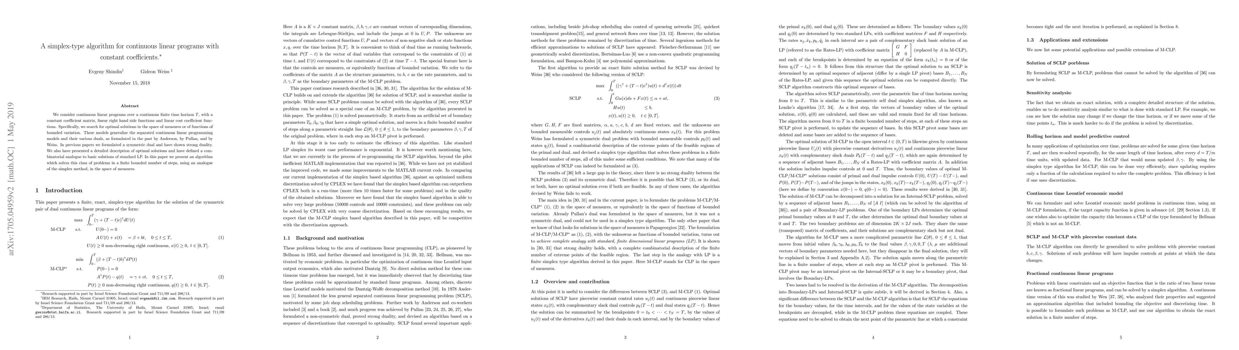 We consider continuous linear programs over a continuous finite time horizon $T$, with a constant coefficient matrix, linear right hand side functions and linear cost coefficient functions, where we search for optimal solutions in the space of measures or of functions of bounded variation. These models generalize the separated continuous linear programming models and their various duals, as formulated in the past by Anderson, by Pullan, and by Weiss. In previous papers we have shown that these problems possess optimal strongly dual solutions. We also have presented a detailed description of optimal solutions and have defined a combinatorial analogue to basic solutions of standard LP. In this paper we present an algorithm which solves this class of problems in a finite bounded number of steps, using an analogue of the simplex method, in the space of measures.