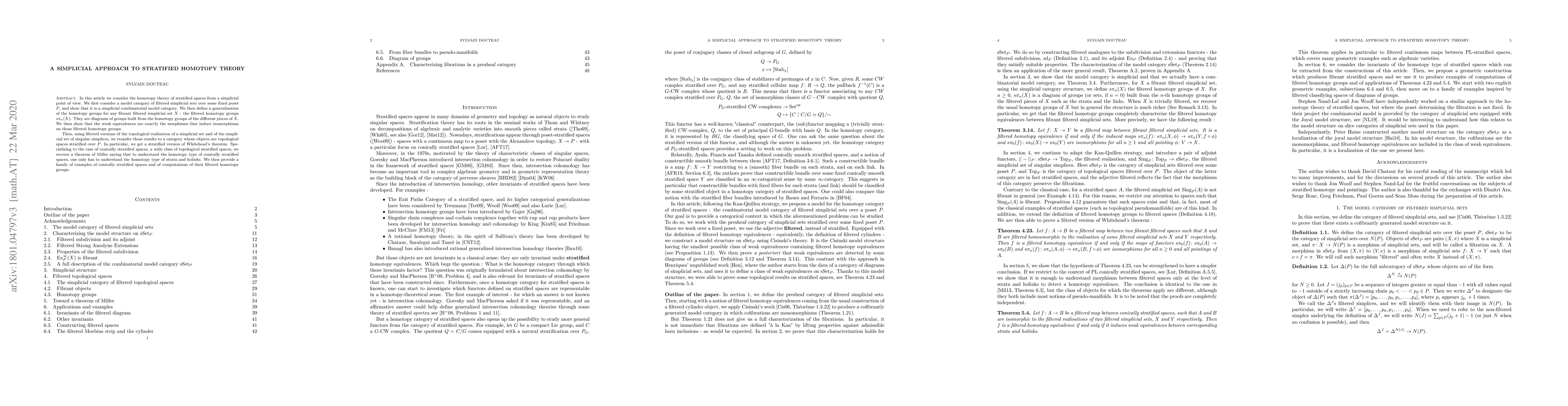 In this article we consider the homotopy theory of stratified spaces through a simplicial point of view. We first consider a model category of filtered simplicial sets over some fixed poset $P$, and show that it is a simplicial combinatorial model category. We then define a generalization of the homotopy groups for any fibrant filtered simplicial set $X$ : the filtered homotopy groups $s\pi_n(X)$. They are diagrams of groups built from the homotopy groups of the different pieces of $X$. We then show that the weak equivalences are exactly the morphisms that induce isomorphisms on those filtered homotopy groups. Then, using filtered versions of the topological realisation of a simplicial set and of the simplicial set of singular simplices, we transfer those results to a category whose objects are topological spaces stratified over $P$. In particular, we get a stratified version of Whitehead's theorem. Specializing to the case of conically stratified spaces, a wide class of topological stratified spaces, we recover a theorem of Miller saying that to understand the homotopy type of conically stratified spaces, one only has to understand the homotopy type of strata and holinks. We then provide a family of examples of conically stratified spaces and of computations of their filtered homotopy groups.