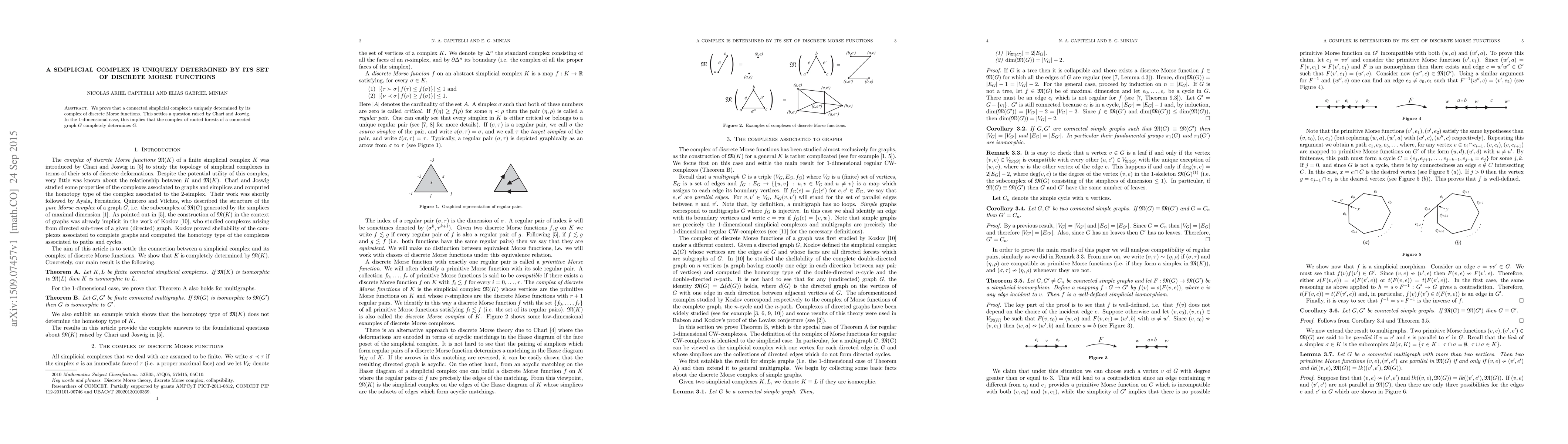 The paper proves that a connected simplicial complex is uniquely determined by its complex of discrete Morse functions, resolving a question posed by Chari and Joswig, and showing that for connected graphs, the complex of rooted forests uniquely determines the graph itself.