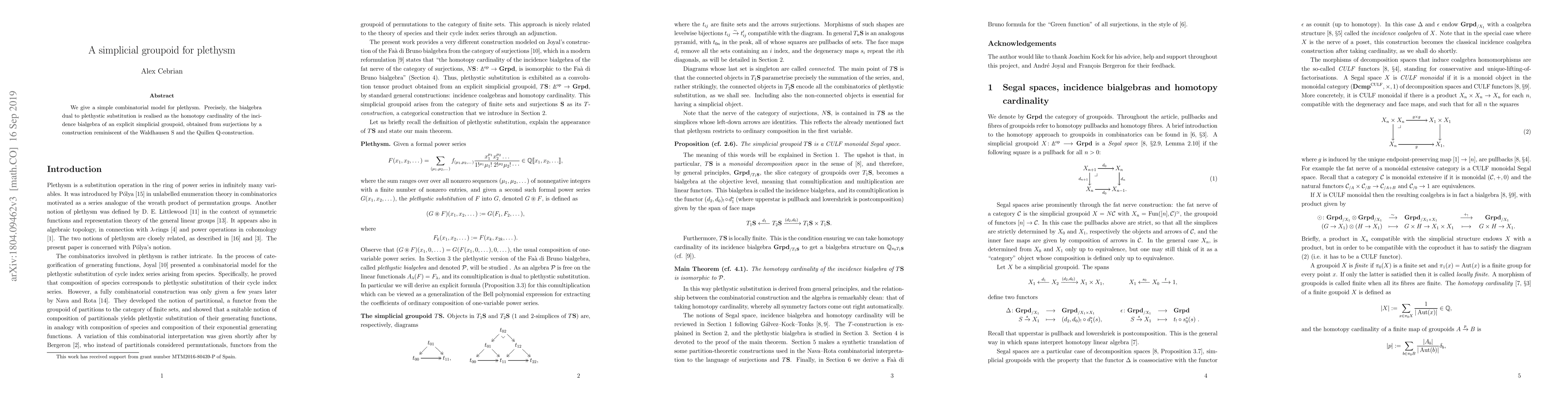 Researchers created a simple model for plethysm using a combinatorial simplicial groupoid, which is the bialgebra dual to plethystic substitution, and found its connection to homotopy cardinality of an incidence bialgebra.