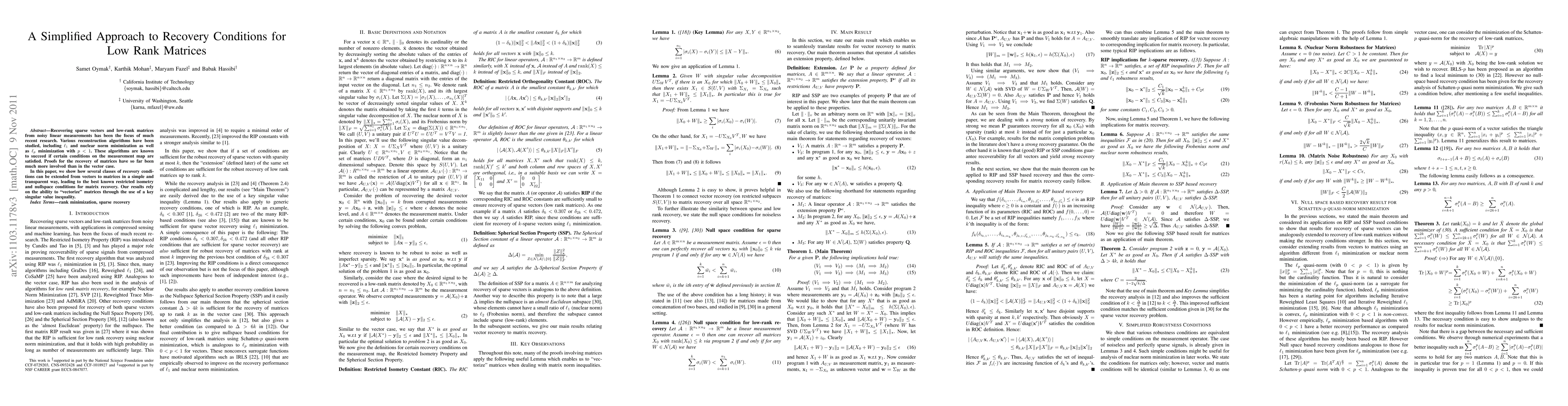 Recovering sparse vectors and low-rank matrices from noisy linear measurements has been the focus of much recent research. Various reconstruction algorithms have been studied, including $\ell_1$ and nuclear norm minimization as well as $\ell_p$ minimization with $p<1$. These algorithms are known to succeed if certain conditions on the measurement map are satisfied. Proofs of robust recovery for matrices have so far been much more involved than in the vector case. In this paper, we show how several robust classes of recovery conditions can be extended from vectors to matrices in a simple and transparent way, leading to the best known restricted isometry and nullspace conditions for matrix recovery. Our results rely on the ability to "vectorize" matrices through the use of a key singular value inequality.