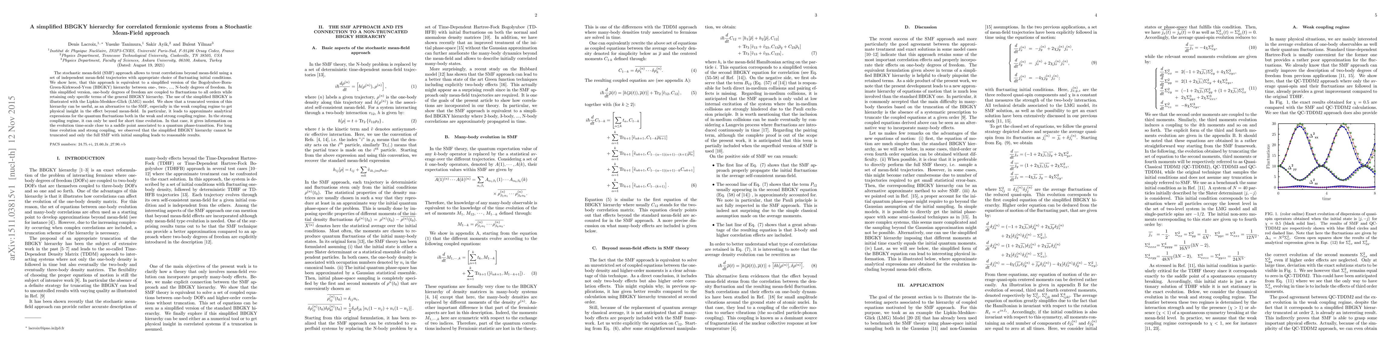 The paper proposes a simplified BBGKY hierarchy derived from the stochastic mean-field approach to treat correlations beyond mean-field in fermionic systems. The simplified BBGKY hierarchy provides analytical expressions for quantum fluctuations, especially useful in weak coupling regimes, but requires full stochastic sampling for long time evolution in strong coupling.