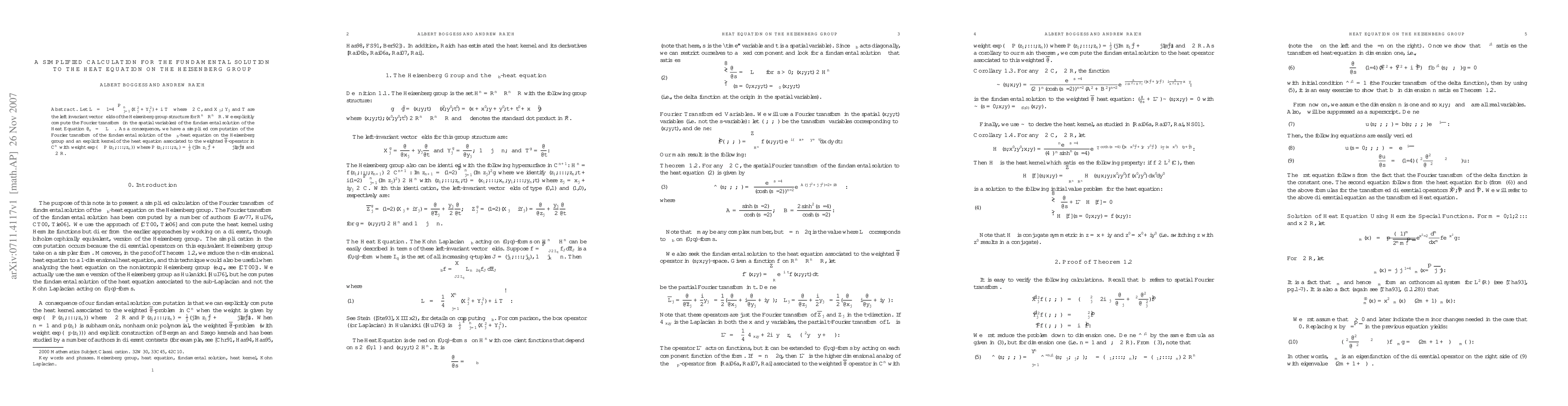 Let $L = -1/4 (\sum_{j=1}^n(X_j^2+Y_j^2)+i\gamma T)$ where $\gamma$ is a complex number, $X_j$, $Y_j$, and $T$ are the left invariant vector fields of the Heisenberg group structure for $R^n \times R^n \times R$. We explicitly compute the Fourier transform (in the spatial variables) of the fundamental solution of the Heat Equation $\partial_s\rho = -L\rho$. As a consequence, we have a simplified computation of the Fourier transform of the fundamental solution of the $\Box_b$-heat equation on the Heisenberg group and an explicit kernel of the heat equation associated to the weighted dbar-operator in $C^n$ with weight $\exp(-\tau P(z_1,...,z_n))$ where $P(z_1,...,z_n) = 1/2(x_1^2 + >... x_n^2)$, $z_j=x_j+iy_j$, and $\tau\in R$.