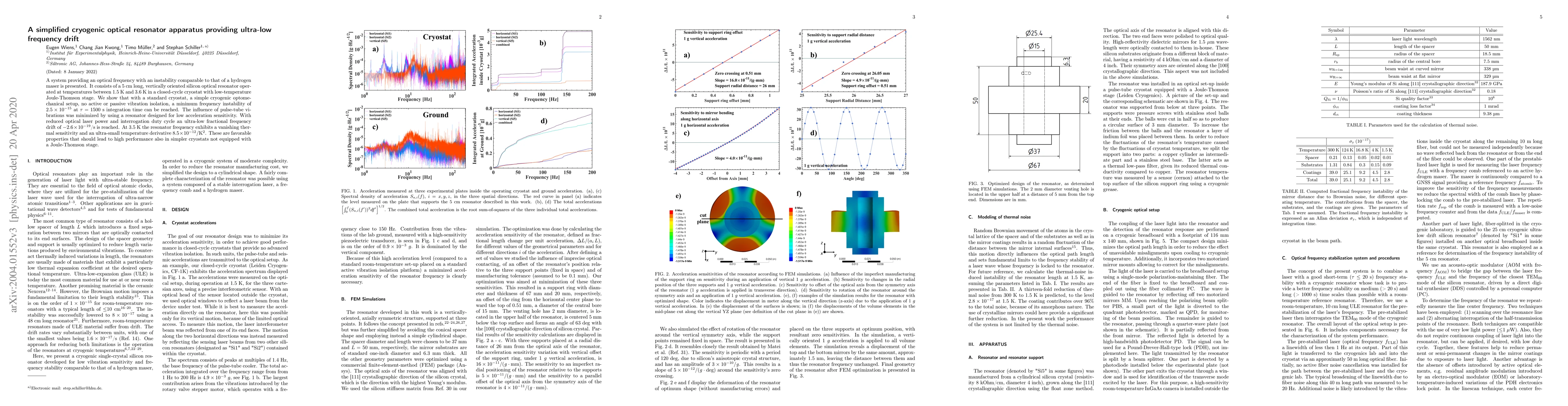 A system providing an optical frequency with an instability comparable to that of a hydrogen maser is presented. It consists of a $5$ $\mathrm{cm}$ long, vertically oriented silicon optical resonator operated at temperatures between $1.5$ $\mathrm{K}$ and $3.6$ $\mathrm{K}$ in a closed-cycle cryostat with low-temperature Joule-Thomson stage. We show that with a standard cryostat, a simple cryogenic optomechanical setup, no active or passive vibration isolation, a minimum frequency instability of $2.5\times10^{-15}$ at $\tau=1500$ $\mathrm{s}$ integration time can be reached. The influence of pulse-tube vibrations was minimized by using a resonator designed for low acceleration sensitivity. With reduced optical laser power and interrogation duty cycle an ultra-low fractional frequency drift of $-2.6\times10^{-19}$/$\mathrm{s}$ is reached. At $3.5$ $\mathrm{K}$ the resonator frequency exhibits a vanishing thermal sensitivity and an ultra-small temperature derivative $8.5\times10^{-12}/\mathrm{K}^{2}$. These are favorable properties that should lead to high performance also in simpler cryostats not equipped with a Joule-Thomson stage.