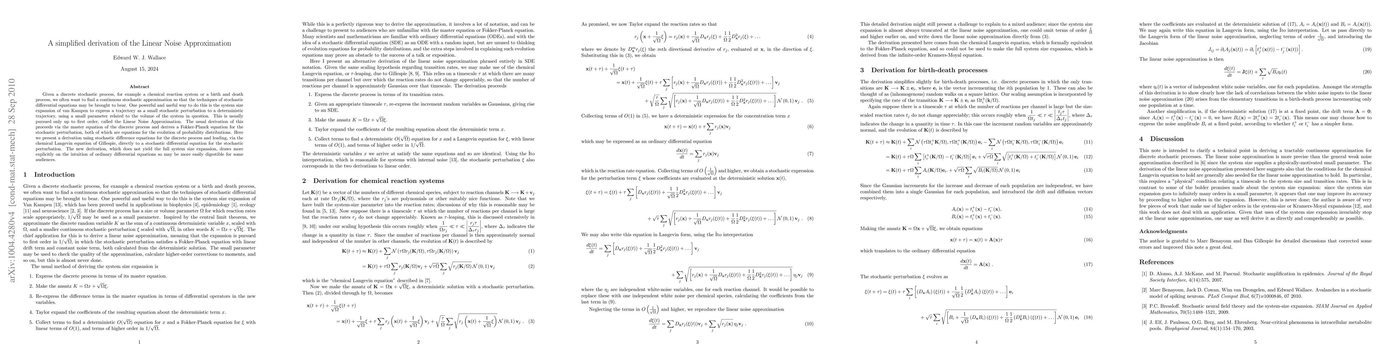 Researchers present a simplified derivation of the Linear Noise Approximation, a method for converting discrete stochastic processes into continuous stochastic equations, using stochastic difference equations.