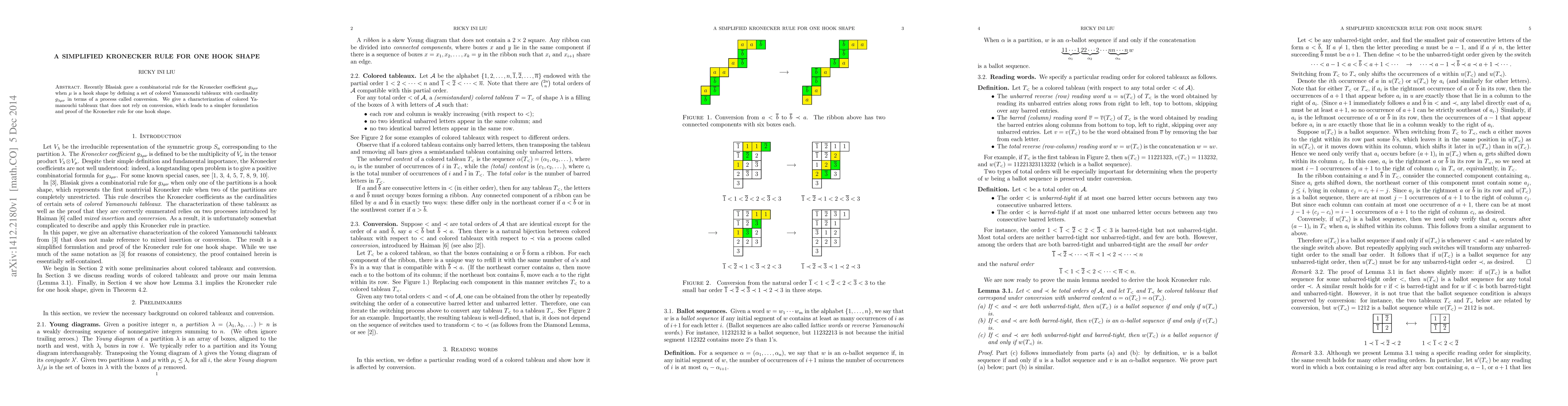 Recently Blasiak gave a combinatorial rule for the Kronecker coefficient $g_{\lambda \mu \nu}$ when $\mu$ is a hook shape by defining a set of colored Yamanouchi tableaux with cardinality $g_{\lambda\mu\nu}$ in terms of a process called conversion. We give a characterization of colored Yamanouchi tableaux that does not rely on conversion, which leads to a simpler formulation and proof of the Kronecker rule for one hook shape.
