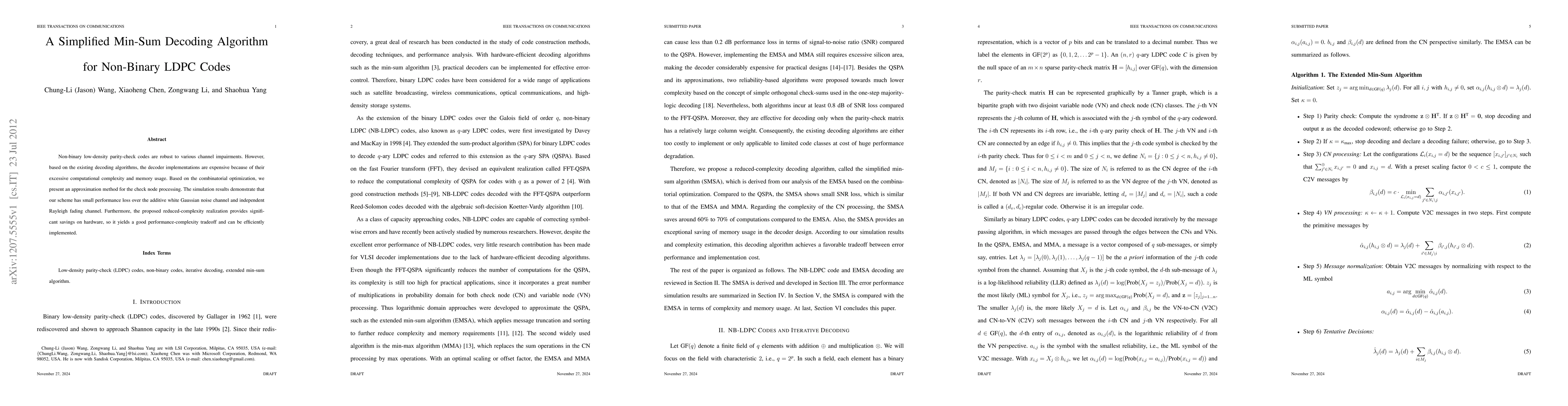 The paper presents a simplified Min-Sum decoding algorithm for non-binary LDPC codes, reducing complexity through an approximation method for check node processing based on combinatorial optimization.