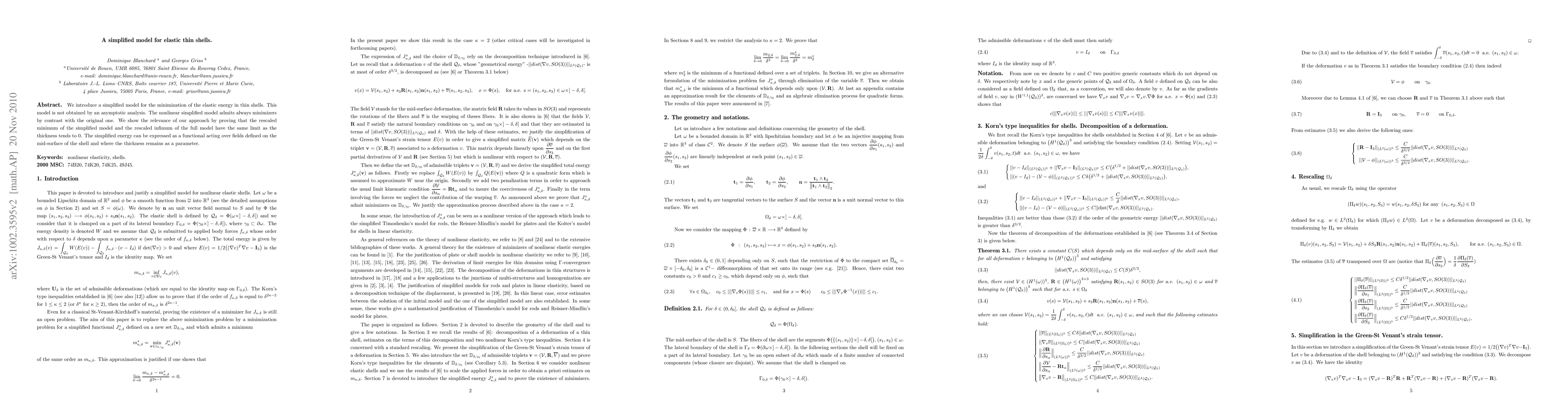 We introduce a simplified model for the minimization of the elastic energy in thin shells. This model is not obtained by an asymptotic analysis. The thickness of the shell remains a parameter as in Reisner-Mindlin's model for plates and Koiter's model for shells in the linear case. The simplified model admits always minimizers by contrast with the original one. We show the relevance of our approach by proving that the minimum of the simplified model and the infimum of the full model have the same limit as the thickness tends to 0.