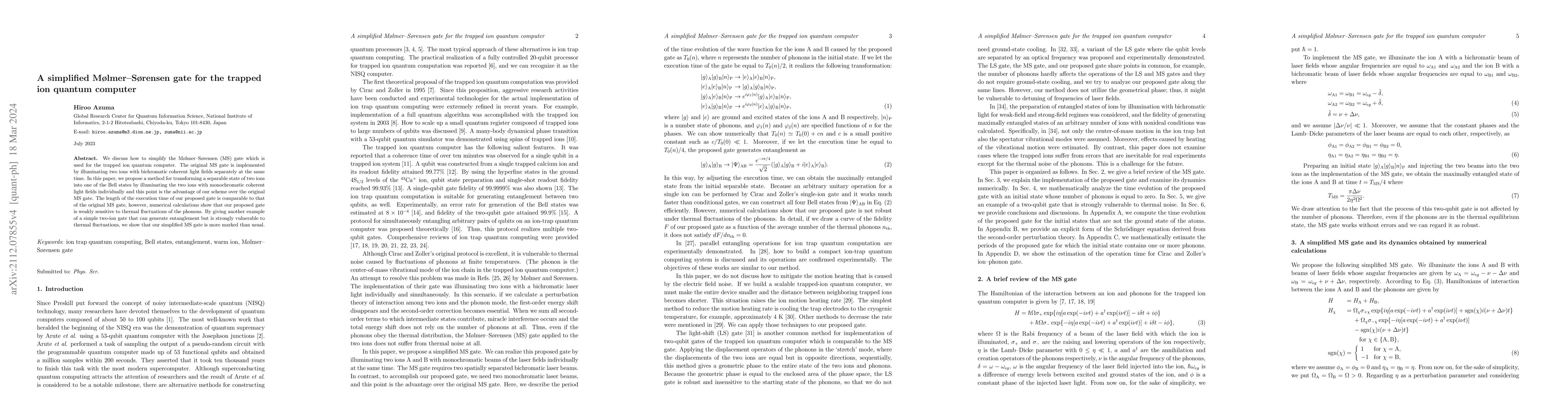 We discuss how to simplify the Molmer-Sorensen (MS) gate which is used for the trapped ion quantum computer. The original MS gate is implemented by illuminating two ions with bichromatic coherent light fields separately at the same time. In this paper, we propose a method for transforming a separable state of two ions into one of the Bell states by illuminating the two ions with monochromatic coherent light fields individually and this point is the advantage of our scheme over the original MS gate. The length of the execution time of our proposed gate is comparable to that of the original MS gate, however, numerical calculations show that our proposed gate is weakly sensitive to thermal fluctuations of the phonons. By giving another example of a simple two-ion gate that can generate entanglement but is strongly vulnerable to thermal fluctuations, we show that our simplified MS gate is more marked than usual.