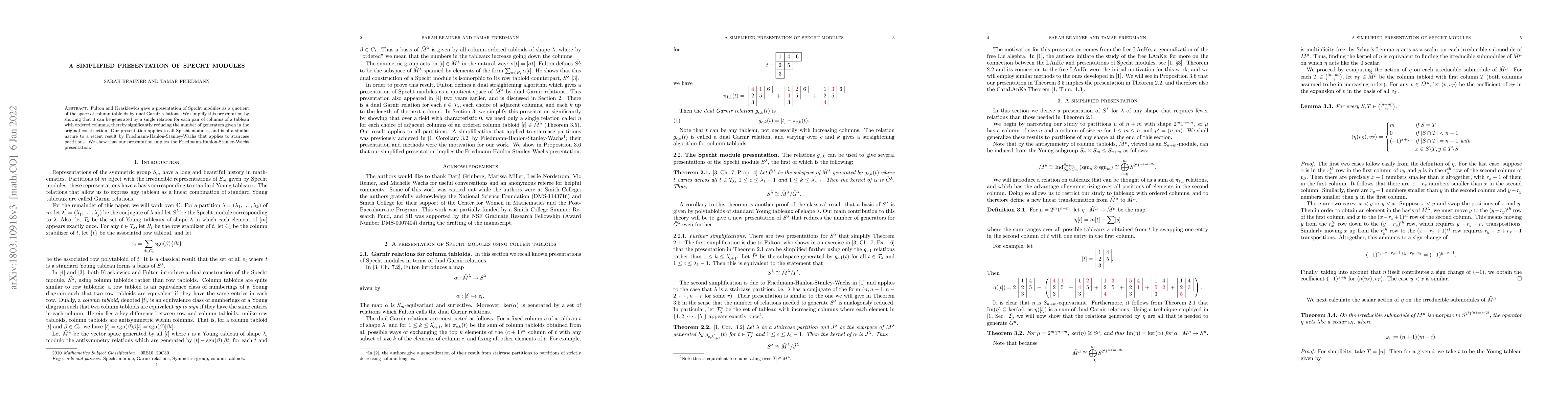 Researchers simplify the presentation of Specht modules by reducing the number of generators to a single relation for each pair of columns, improving efficiency.