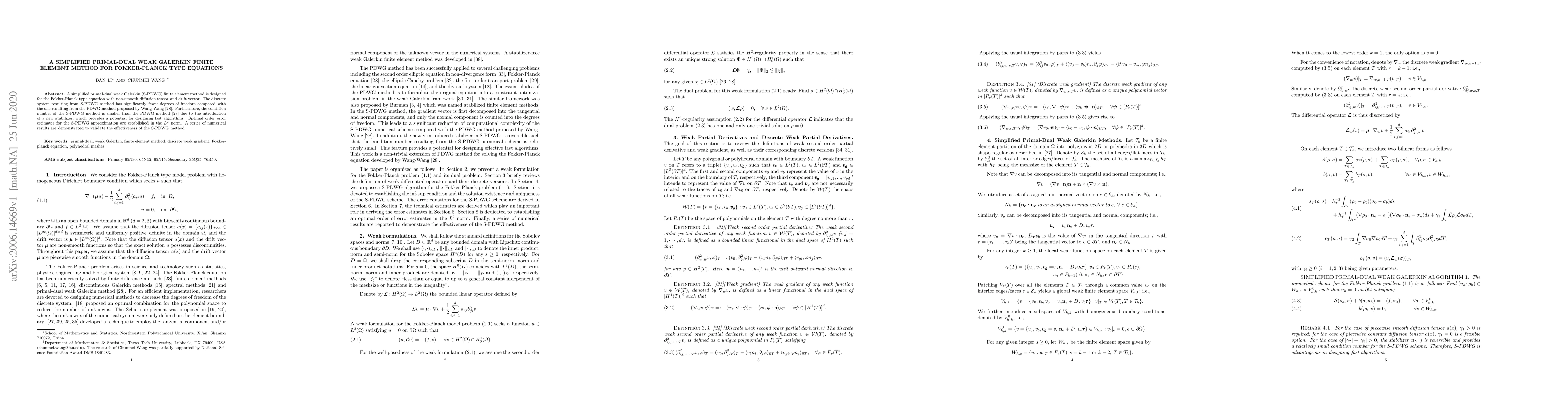 The paper introduces a simplified primal-dual weak Galerkin (S-PDWG) finite element method for Fokker-Planck type equations, showing it has fewer degrees of freedom and a better condition number than the existing PDWG method. Optimal error estimates and numerical results validate the S-PDWG method's effectiveness.