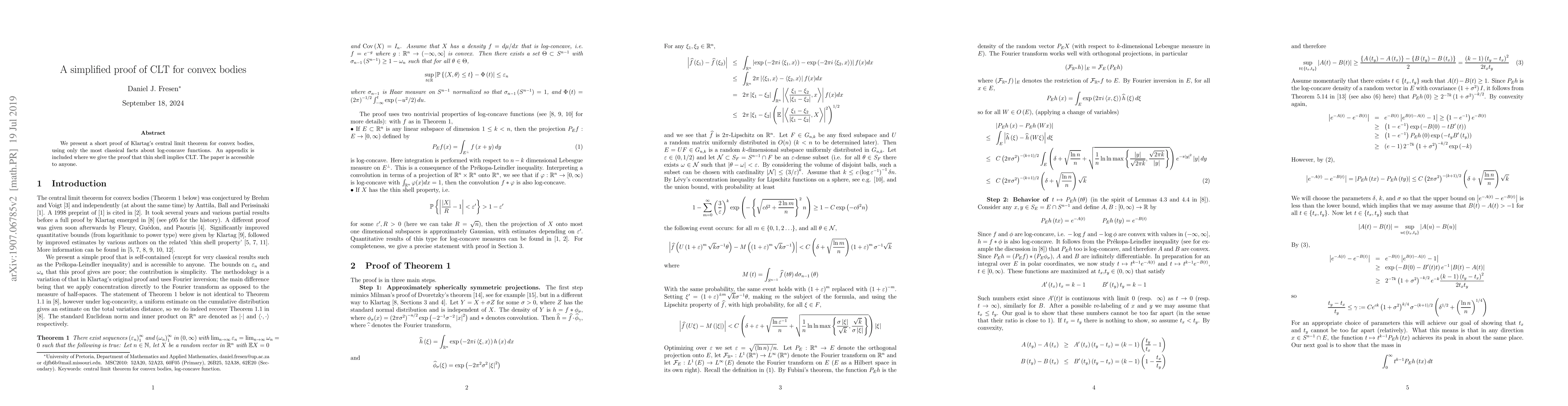 This paper offers a concise proof of Klartag's central limit theorem for convex bodies, relying solely on fundamental properties of log-concave functions. An appendix provides the proof that thin shell conditions lead to the central limit theorem, making the content accessible to a broad audience.