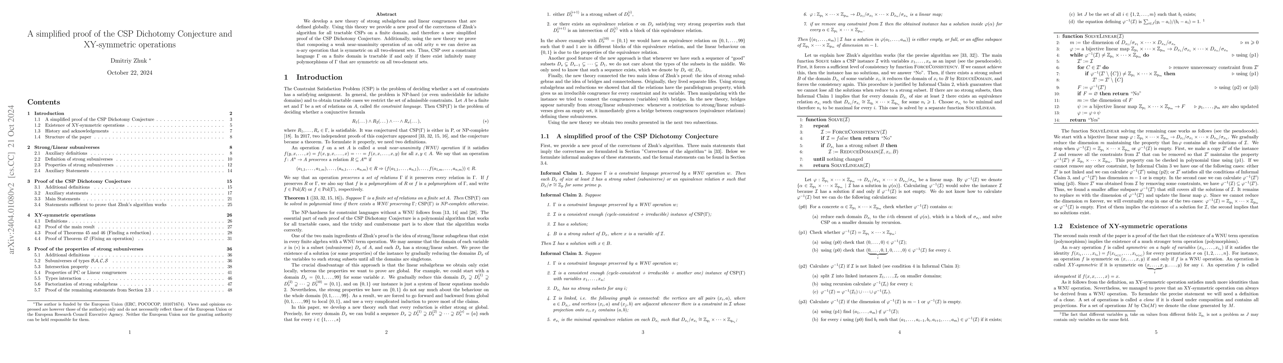 We develop a new theory of strong subalgebras and linear congruences that are defined globally. Using this theory we provide a new proof of the correctness of Zhuk's algorithm for all tractable CSPs on a finite domain, and therefore a new simplified proof of the CSP Dichotomy Conjecture. Additionally, using the new theory we prove that composing a weak near-unanimity operation of an odd arity $n$ we can derive an $n$-ary operation that is symmetric on all two-element sets. Thus, CSP over a constraint language $\Gamma$ on a finite domain is tractable if and only if there exist infinitely many polymorphisms of $\Gamma$ that are symmetric on all two-element sets.