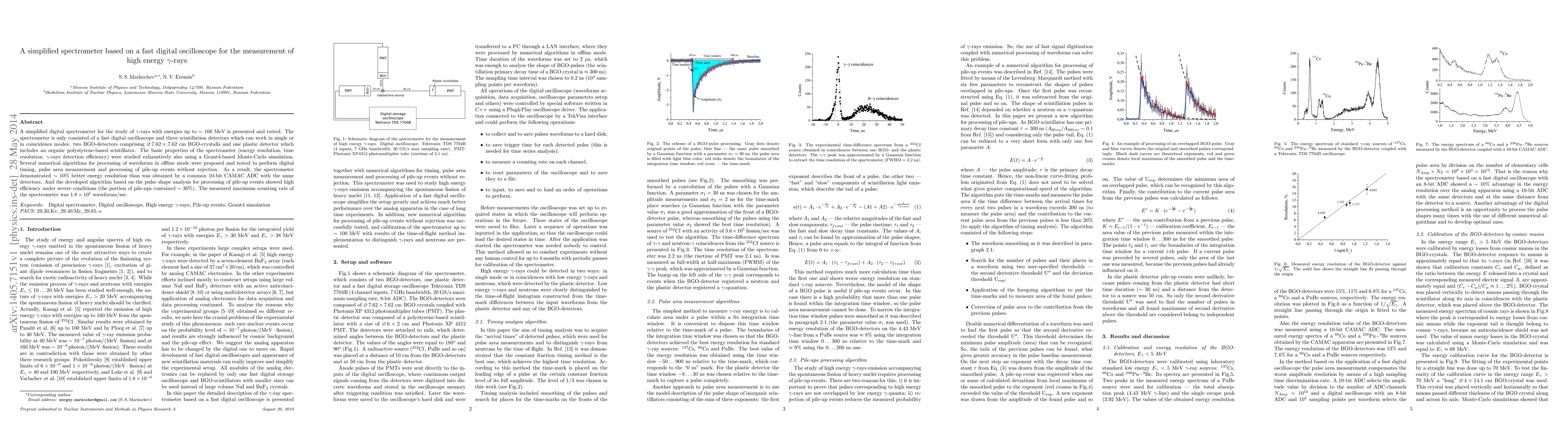 A simplified digital spectrometer for the study of $\gamma$-rays with energies up to $\sim100$ MeV is presented and tested. The spectrometer is only consisted of a fast digital oscilloscope and three scintillation detectors which can work in single or in coincidence modes: two BGO-detectors comprising $\varnothing\,7.62\times7.62$ cm BGO-crystalls and one plastic detector which includes an organic polystyrene-based scintillator. The basic properties of the spectrometer (energy resolution, time resolution, $\gamma$-rays detection efficiency) were studied exhaustively also using a Geant4-based Monte-Carlo simulation. Several numerical algorithms for processing of waveforms in offline mode were proposed and tested to perform digital timing, pulse area measurement and processing of pile-up events without rejection. As a result, the spectrometer demonstrated $\sim10\%$ better energy resolution than was obtained by a common 10-bit CAMAC ADC with the same detectors. And the developed algorithm based on the pulse shape analysis for processing of pile-up events showed high efficiency under severe conditions (the portion of pile-ups contained $\sim30\%$). The measured maximum counting rate of the spectrometer was $1.8\times10^5$ waveforms/sec.