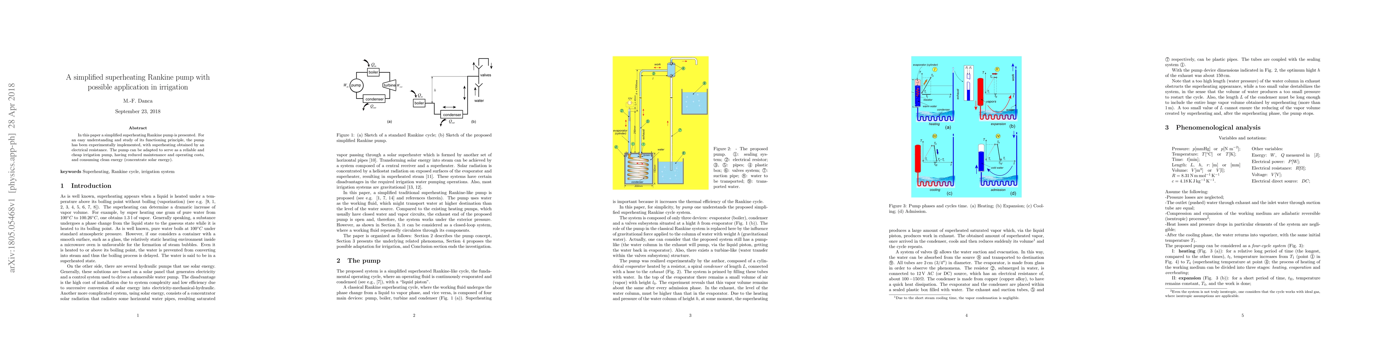 Summary: This paper introduces a simplified superheating Rankine pump, experimentally demonstrated with electrical resistance for superheating, designed for cost-effective and low-maintenance irrigation applications using clean concentrated solar energy.