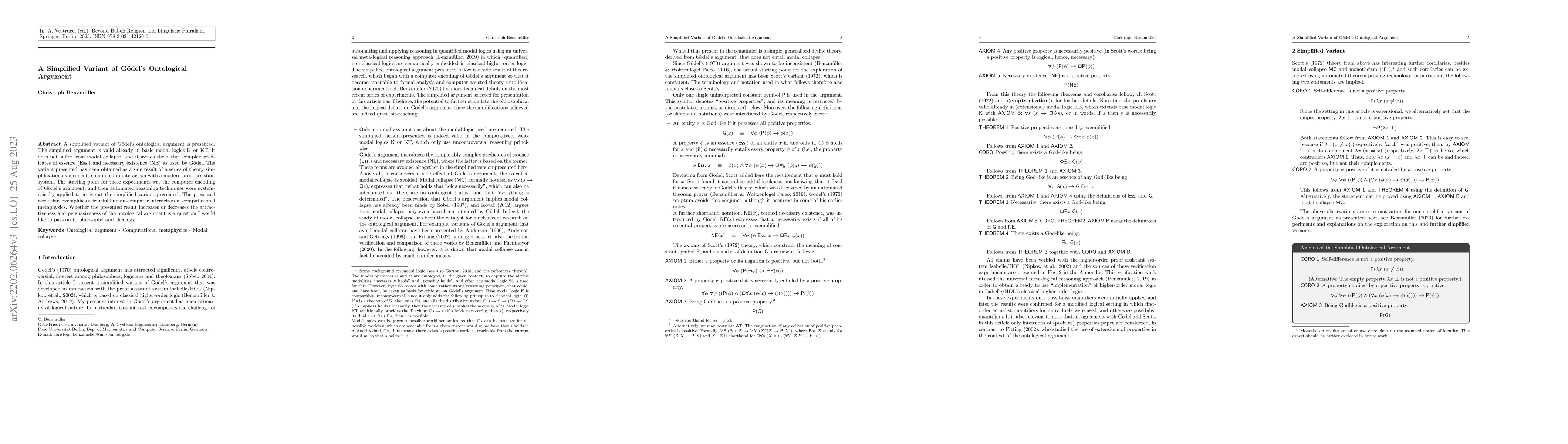 This work presents a novel approach to simplifying Gädel's ontological proof, avoiding modal collapse and enabling full automation.
