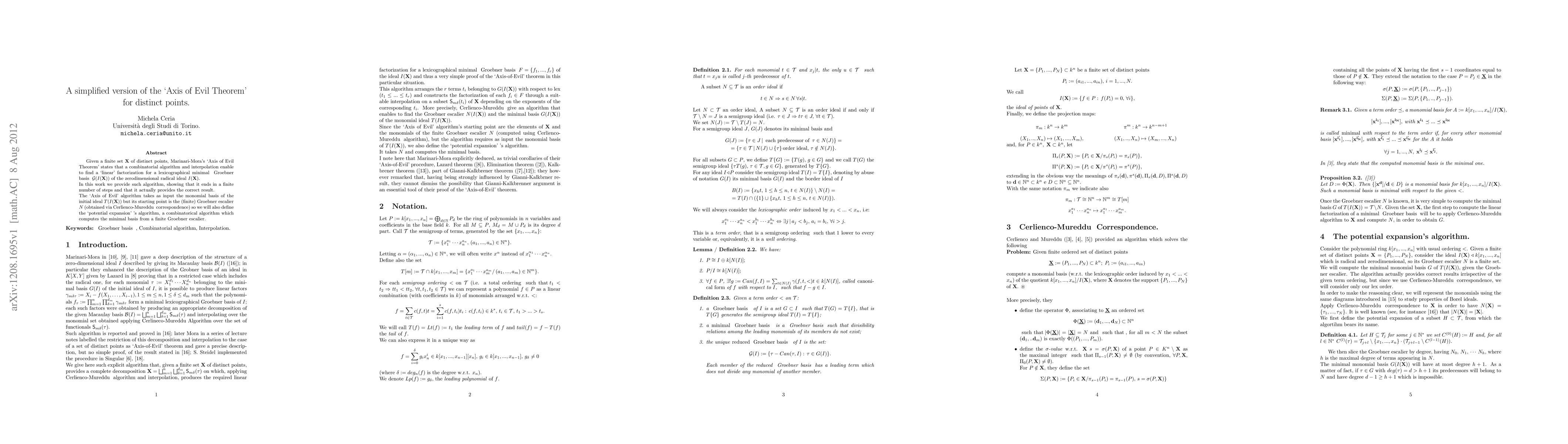 This paper presents a simplified algorithm for Marinari-Mora's 'Axis of Evil Theorem', which finds a linear factorization for the minimal Groebner basis of a set of distinct points. The algorithm, termed 'Axis of Evil', uses a Groebner escalier as its starting point, and the paper proves its finite termination and correctness. Additionally, it introduces a 'potential expansion' algorithm to compute the minimal basis from a finite Groebner escalier.
