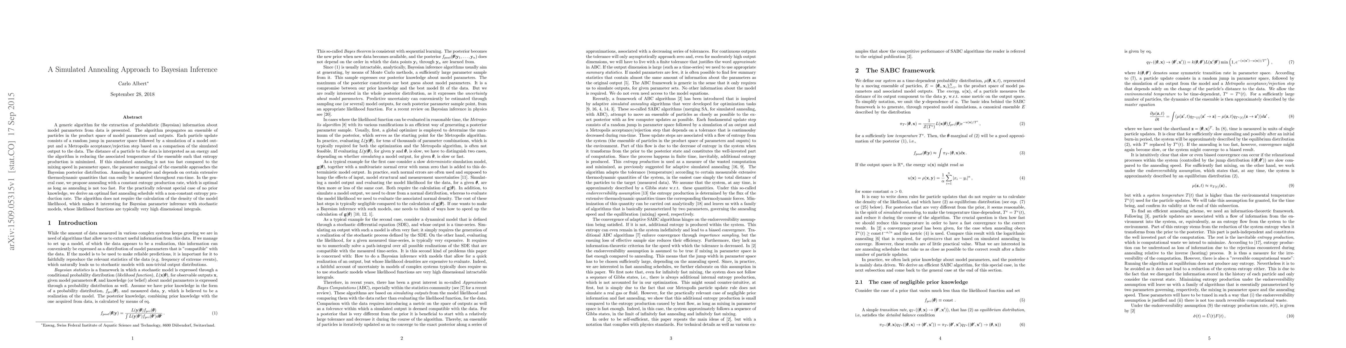 This paper introduces a simulated annealing algorithm for Bayesian inference that propagates an ensemble of particles to extract probabilistic information about model parameters. It minimizes entropy production by adaptively reducing temperature, and it does not require calculating the density of the model likelihood, making it suitable for high-dimensional integrals in stochastic models.